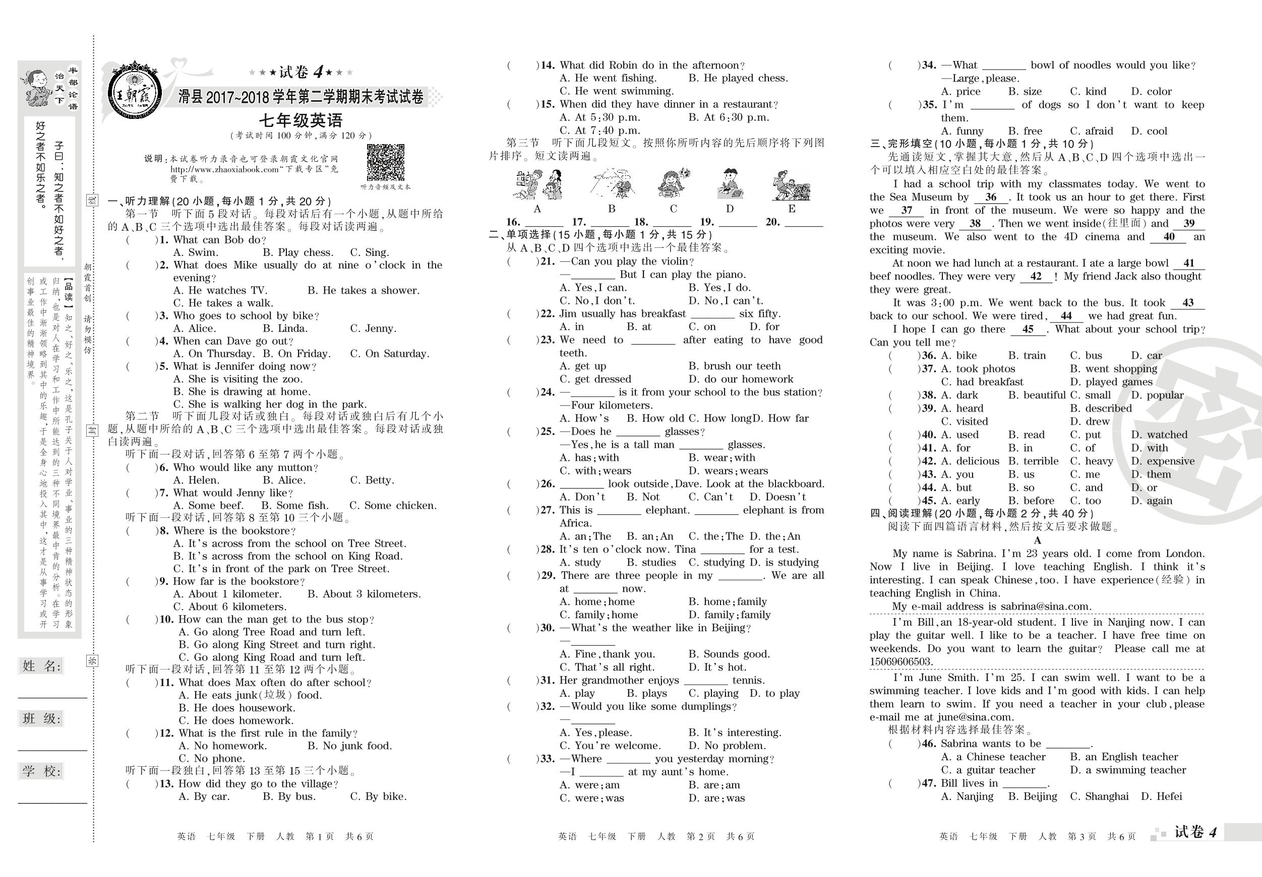 2017-2018学年第二学期安阳市滑县七年级英语试卷(人教版)【4】
