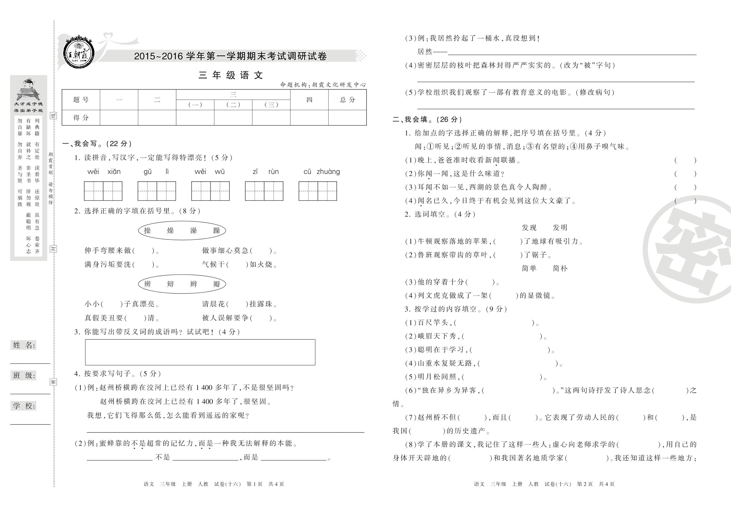 王朝霞期末调研卷三年级上册语文(人教版)【16】