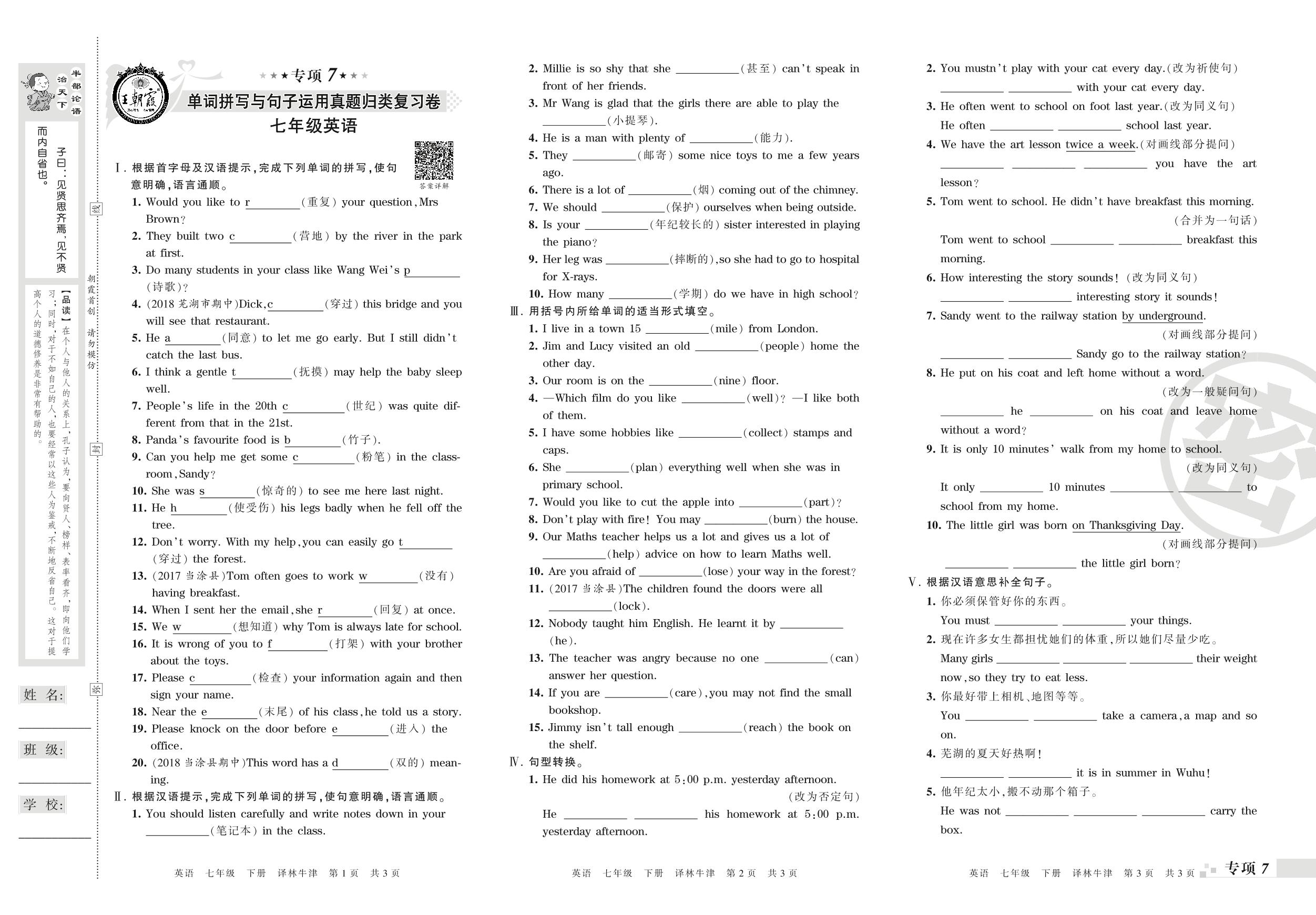 七年级英语译林版(译林牛津版)下册专项卷