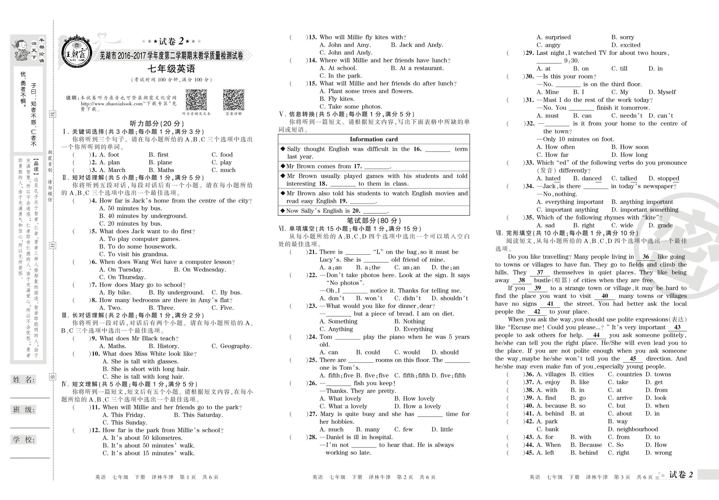 2016-2017学年第二学期芜湖市七年级英语试卷(译林版)【2】
