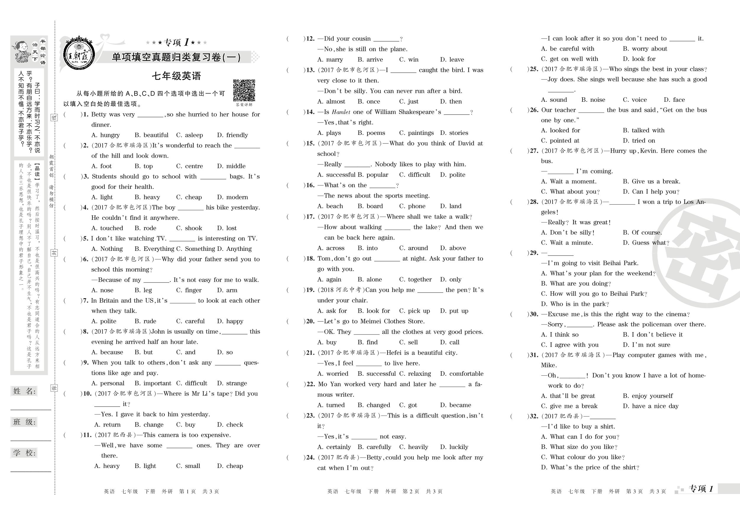 王朝霞期末专项卷——单项填空(一)(二)真题归类复习卷七年级下册英语(外研版)_R210807204401【0】