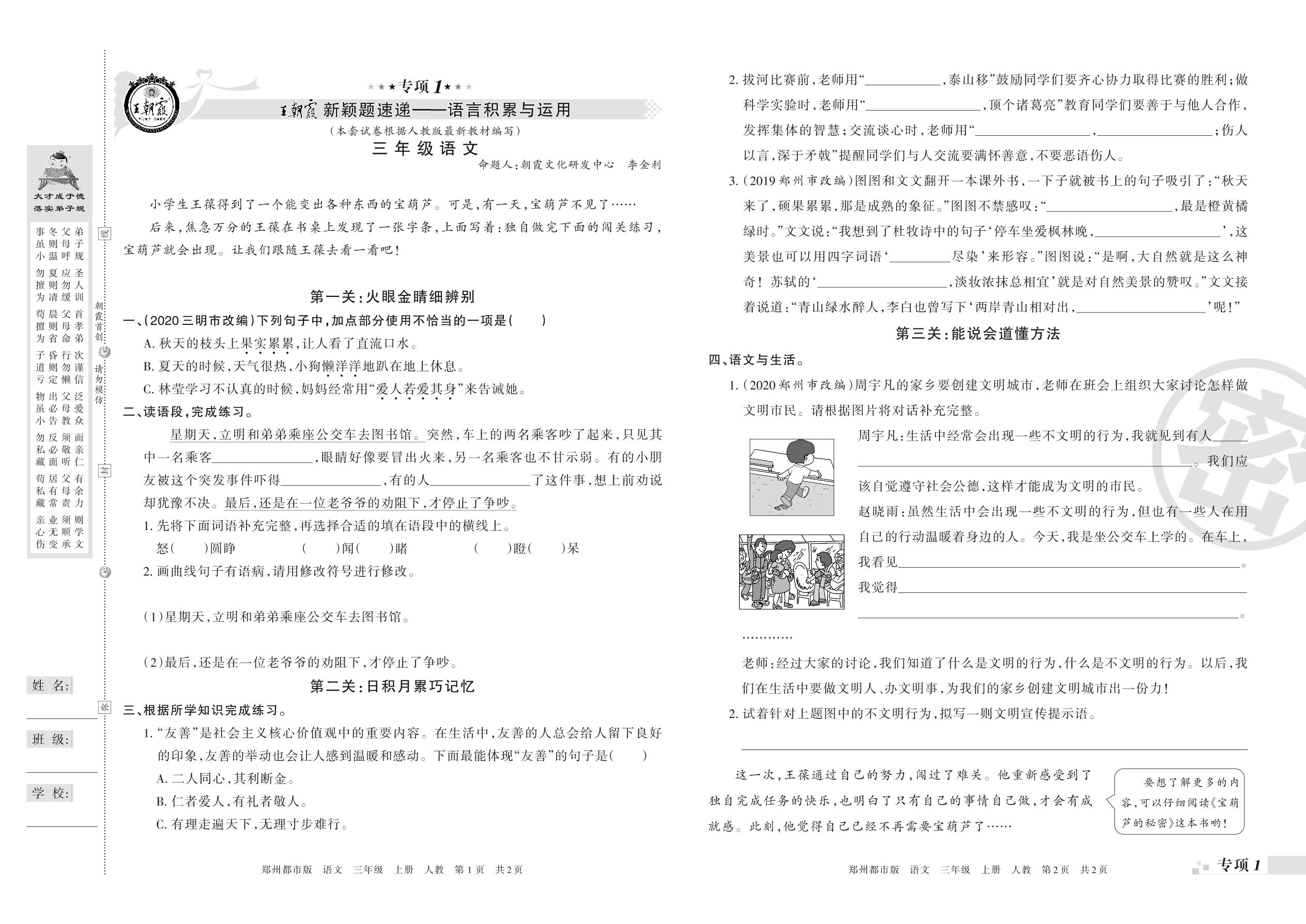 王朝霞期末专项卷——语言积累与运用、非连续性文本阅读三年级上册语文(人教版)_R21080185956【0】