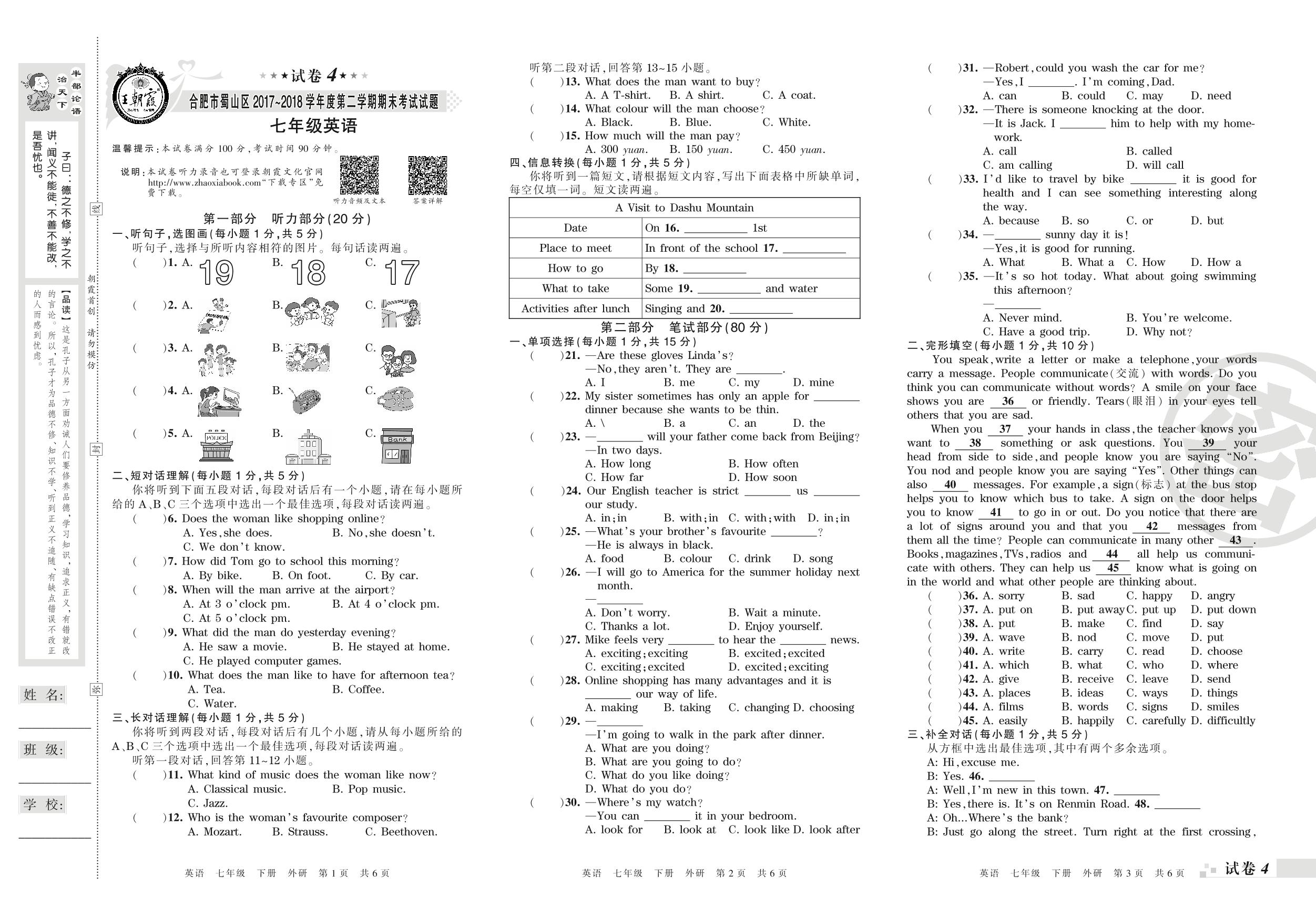 2017-2018学年第二学期合肥市蜀山区七年级英语试卷(外研版)【4】
