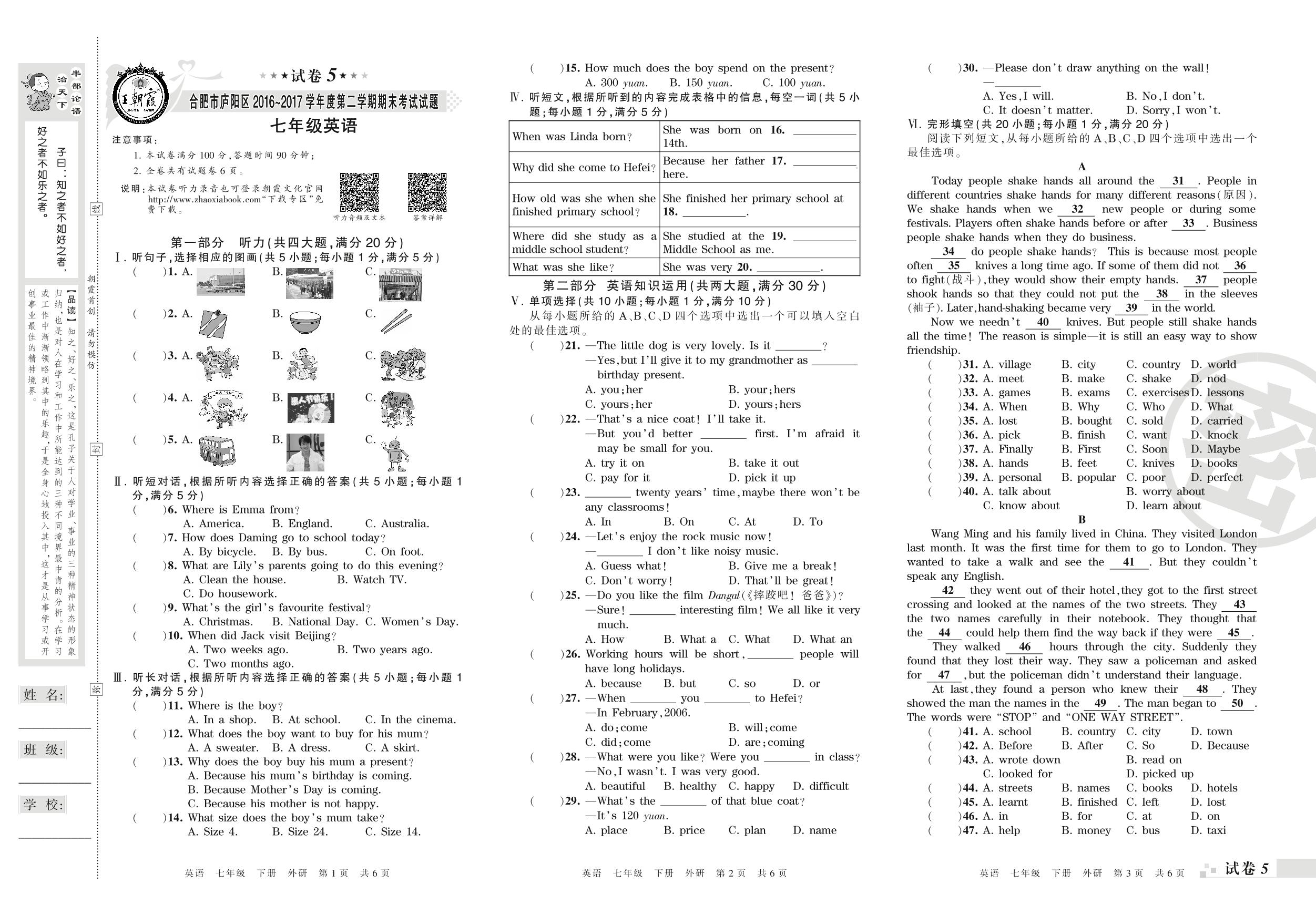 2016-2017学年第二学期合肥市庐阳区七年级英语试卷(外研版)_R210807204453【5】