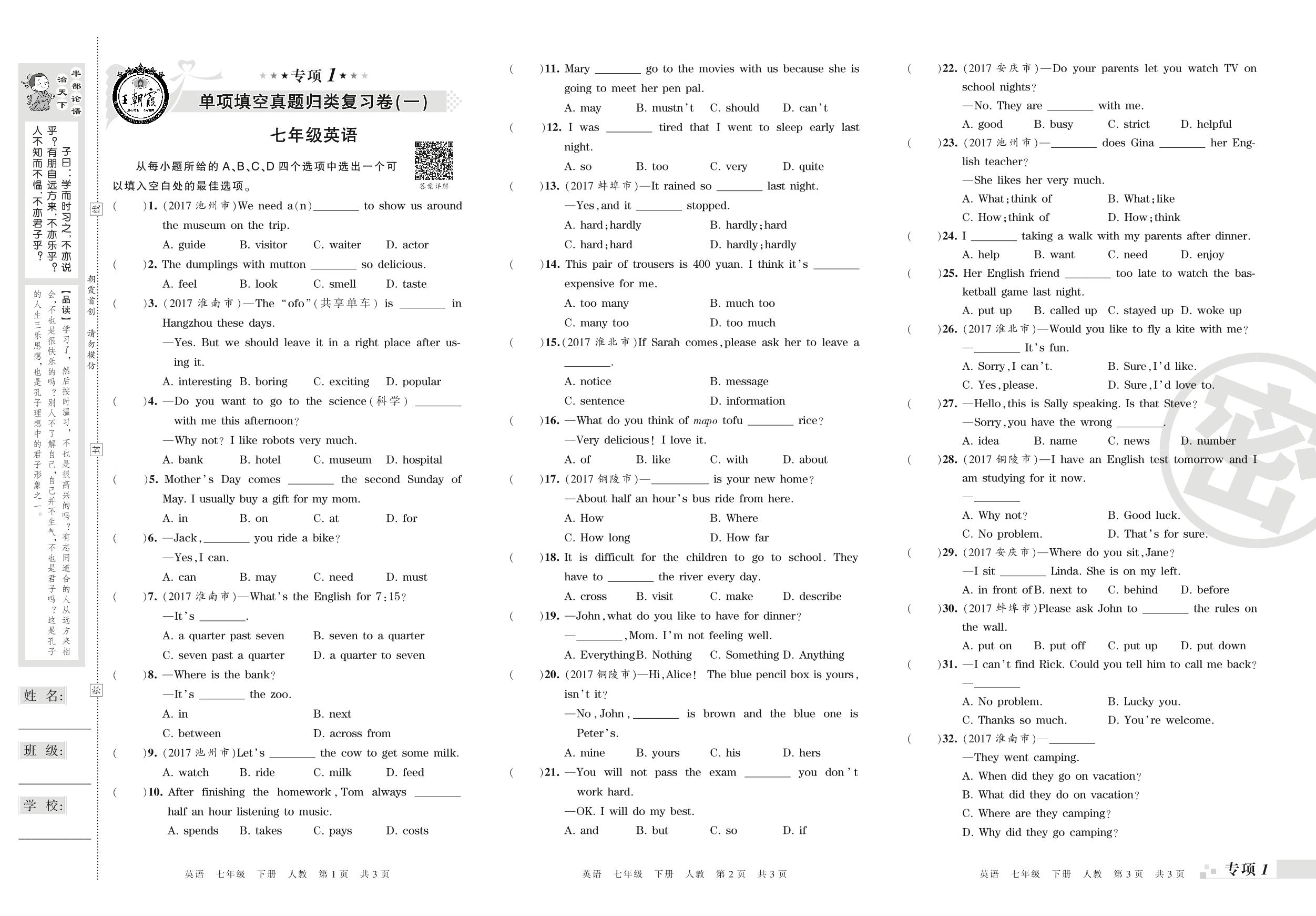 王朝霞期末专项卷——单项填空(一)(二)真题归类复习卷七年级下册英语(人教版)_R210807204541【0】