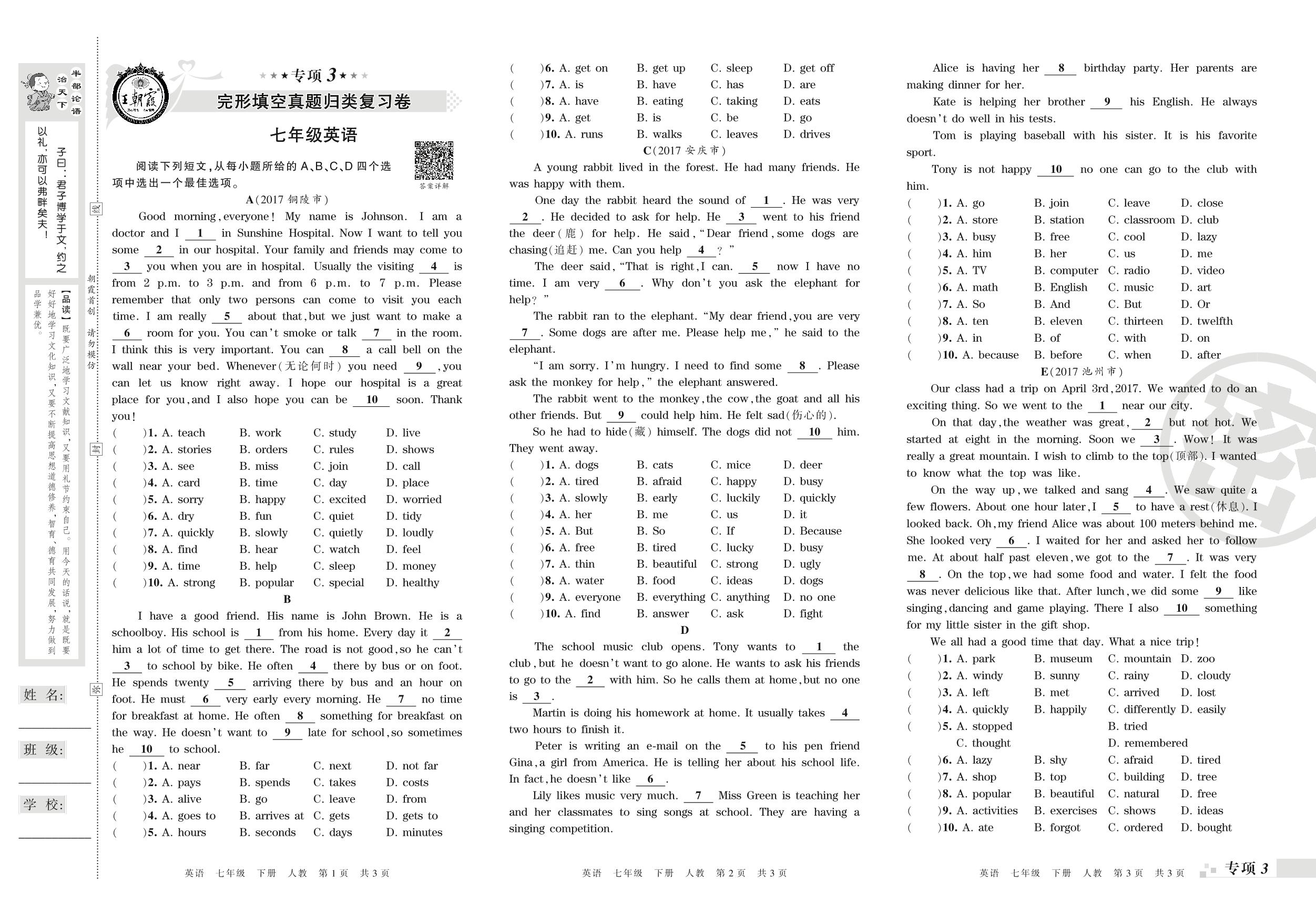 王朝霞期末专项卷——完形填空、任务型阅读真题归类复习卷七年级下册英语(人教版)_R210807204546【0】