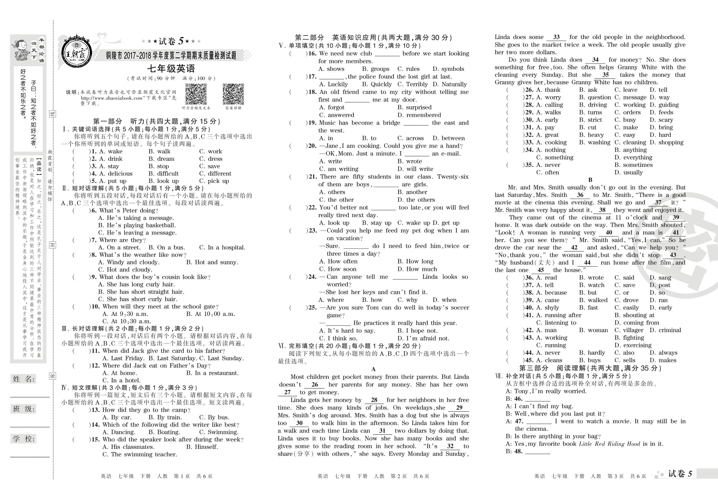 2017-2018学年第二学期铜陵市七年级英语试卷(人教版)【5】