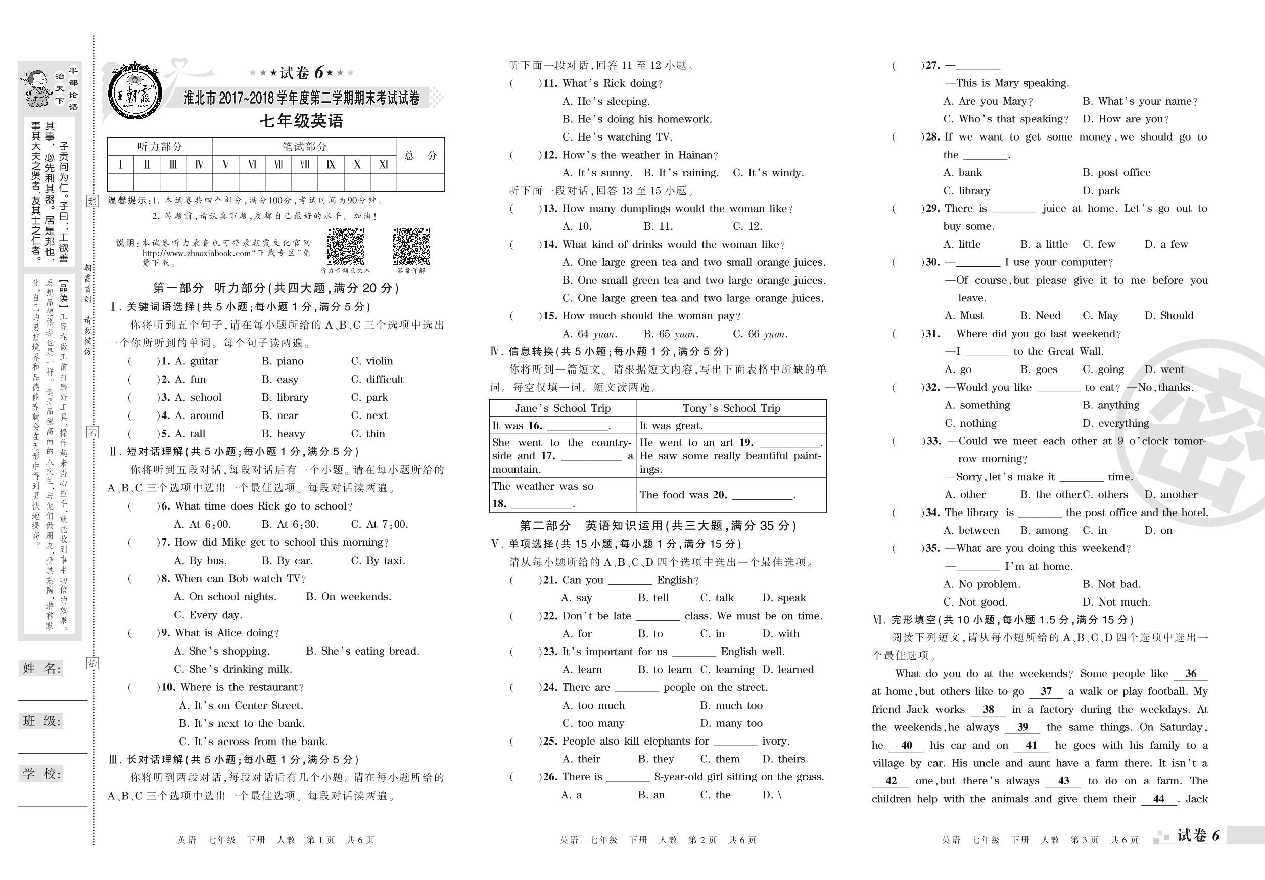 2017-2018学年第二学期淮北市七年级英语试卷(人教版)【6】