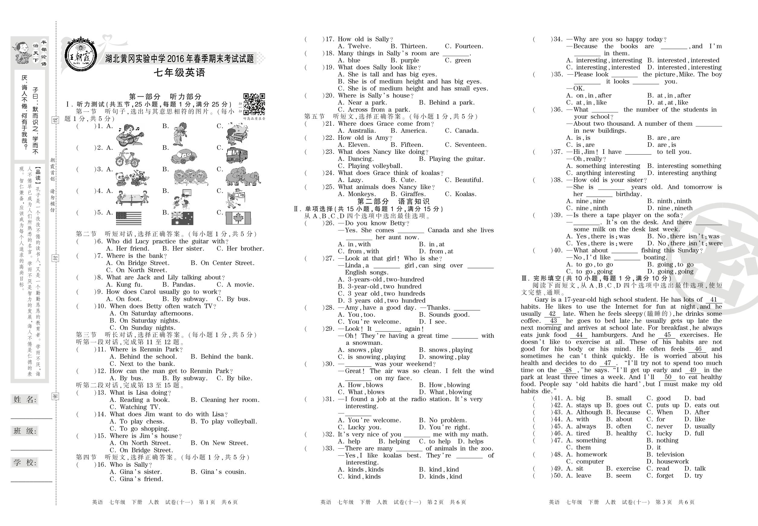 湖北黄冈实验中学七年级下册英语(人教版)_R210807204916【11】