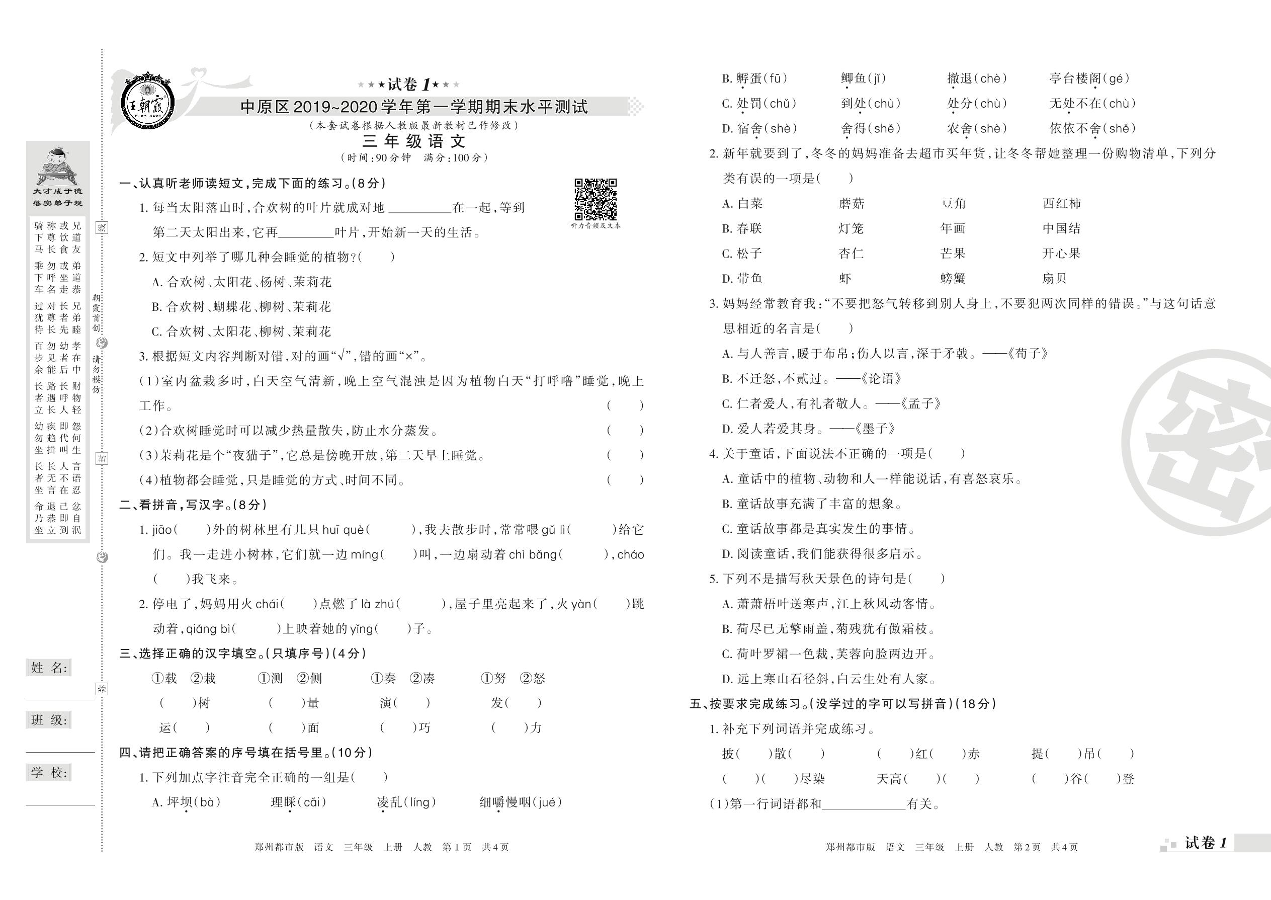 2019-2020学年第一学期郑州市中原区三年级语文试卷(人教版)_R211019141621392【1】