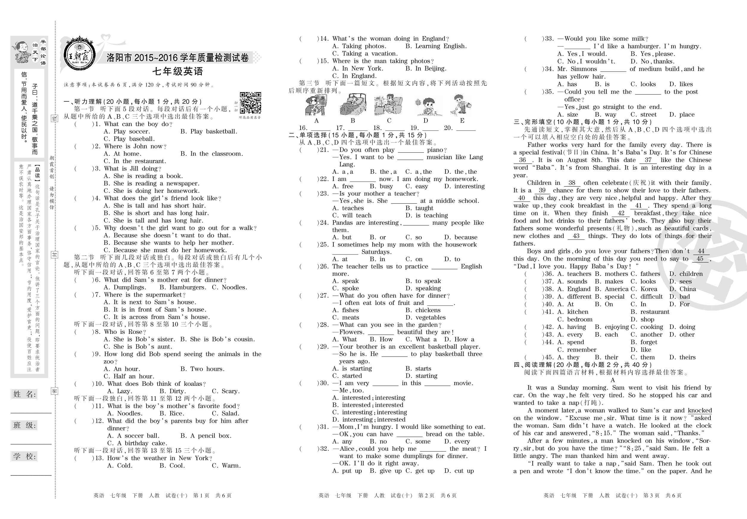 2015-2016学年第二学期洛阳市七年级英语试卷(人教版)【10】