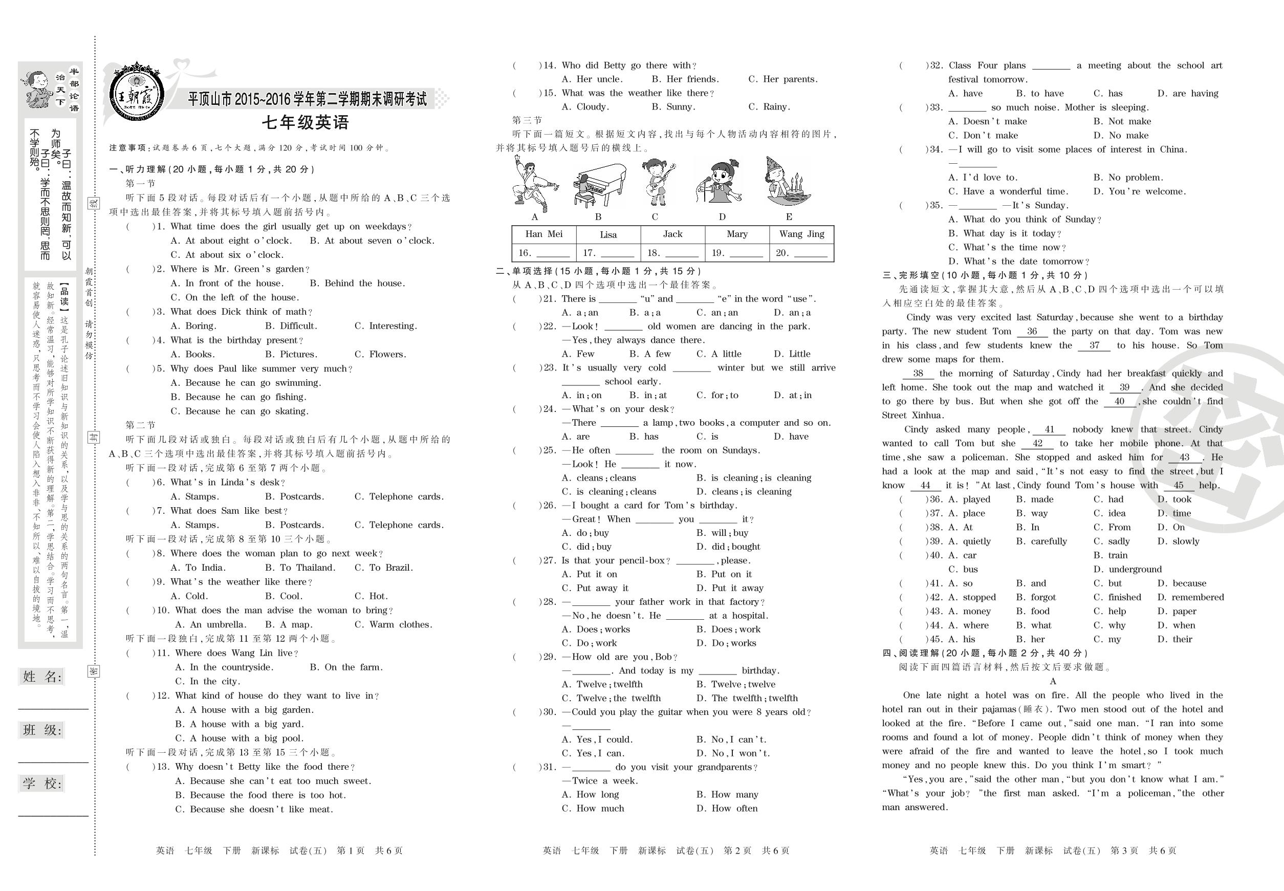 2015-2016学年第二学期平顶山市七年级英语试卷(新课版)【5】