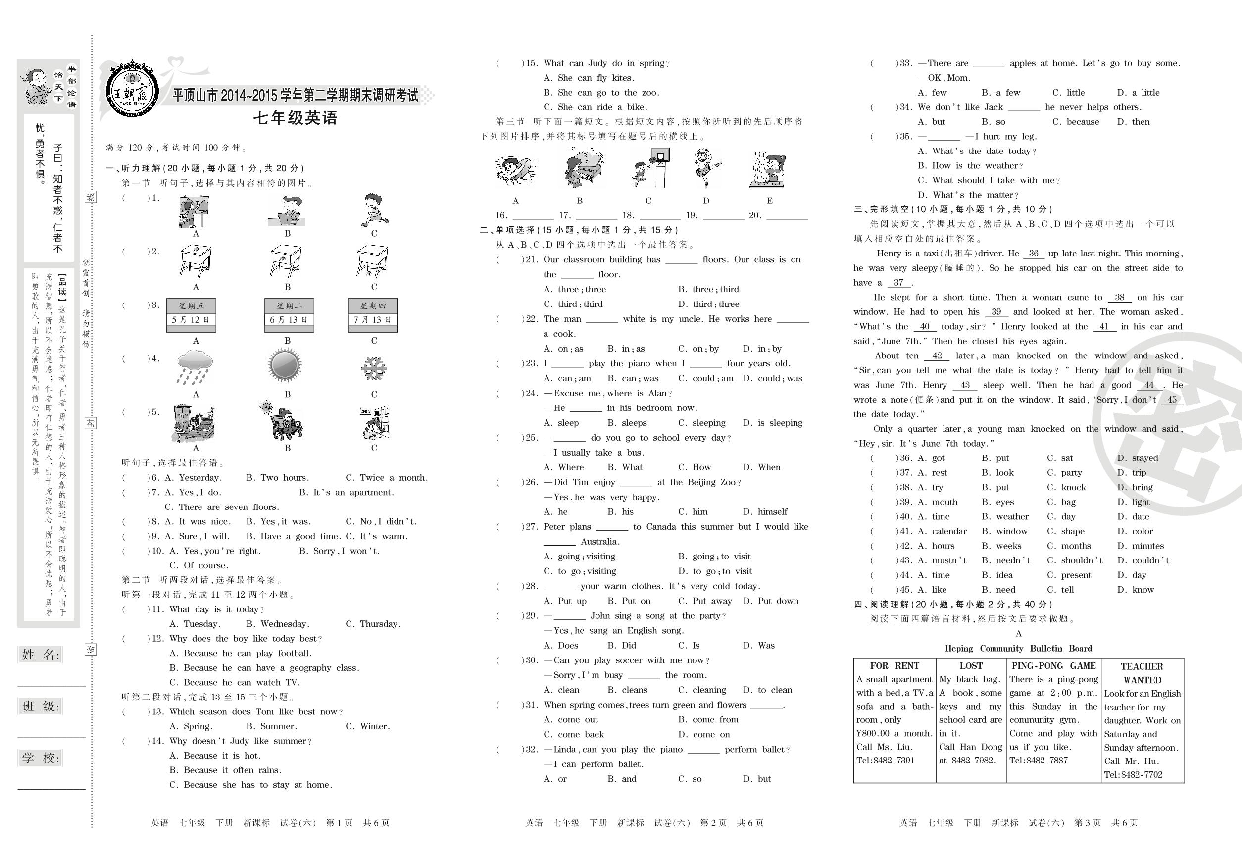 2014-2015学年第二学期平顶山市七年级英语试卷(新课版)【6】