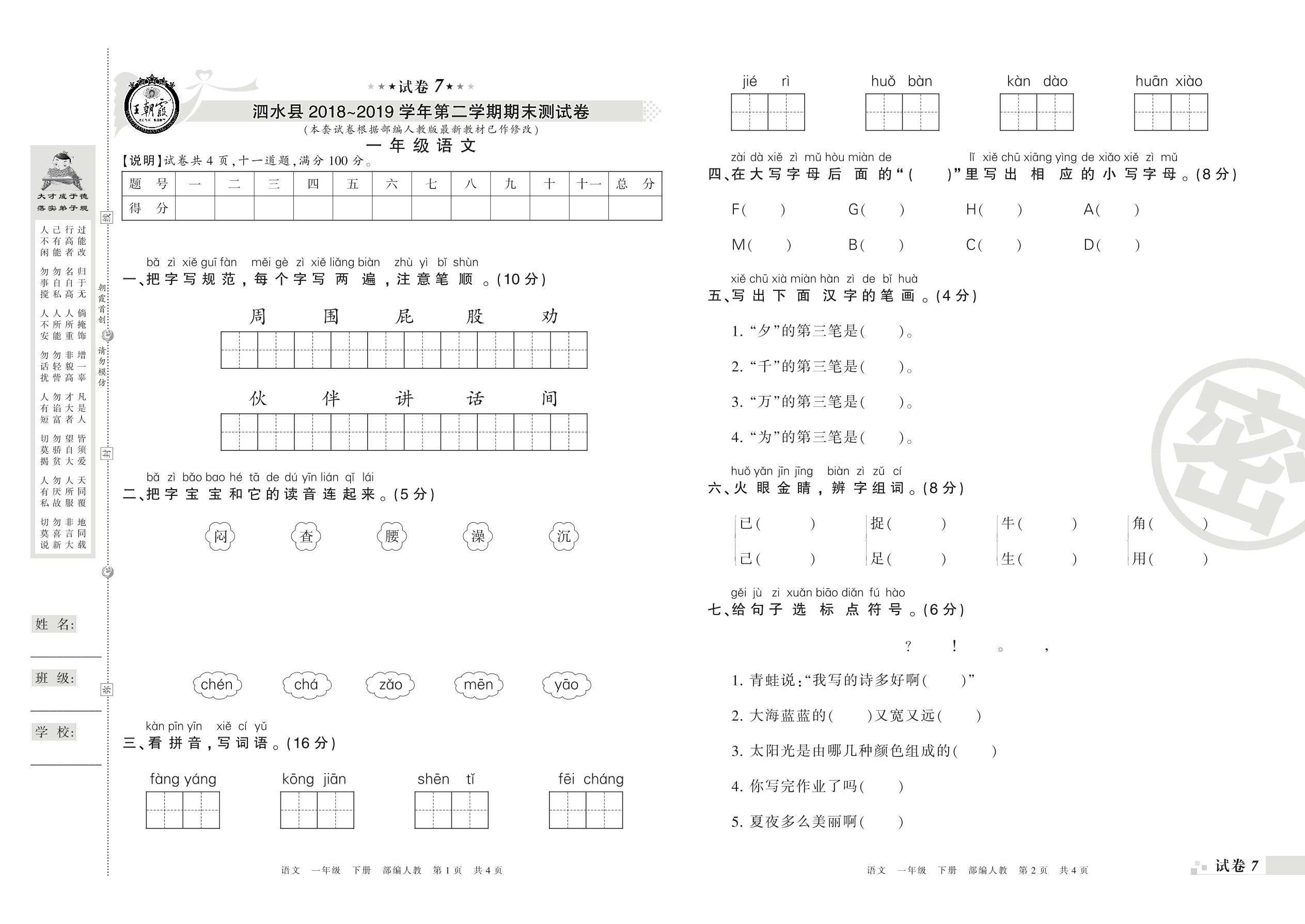 2018-2019学年第二学期济宁市泗水县一年级语文试卷(人教版)【7】