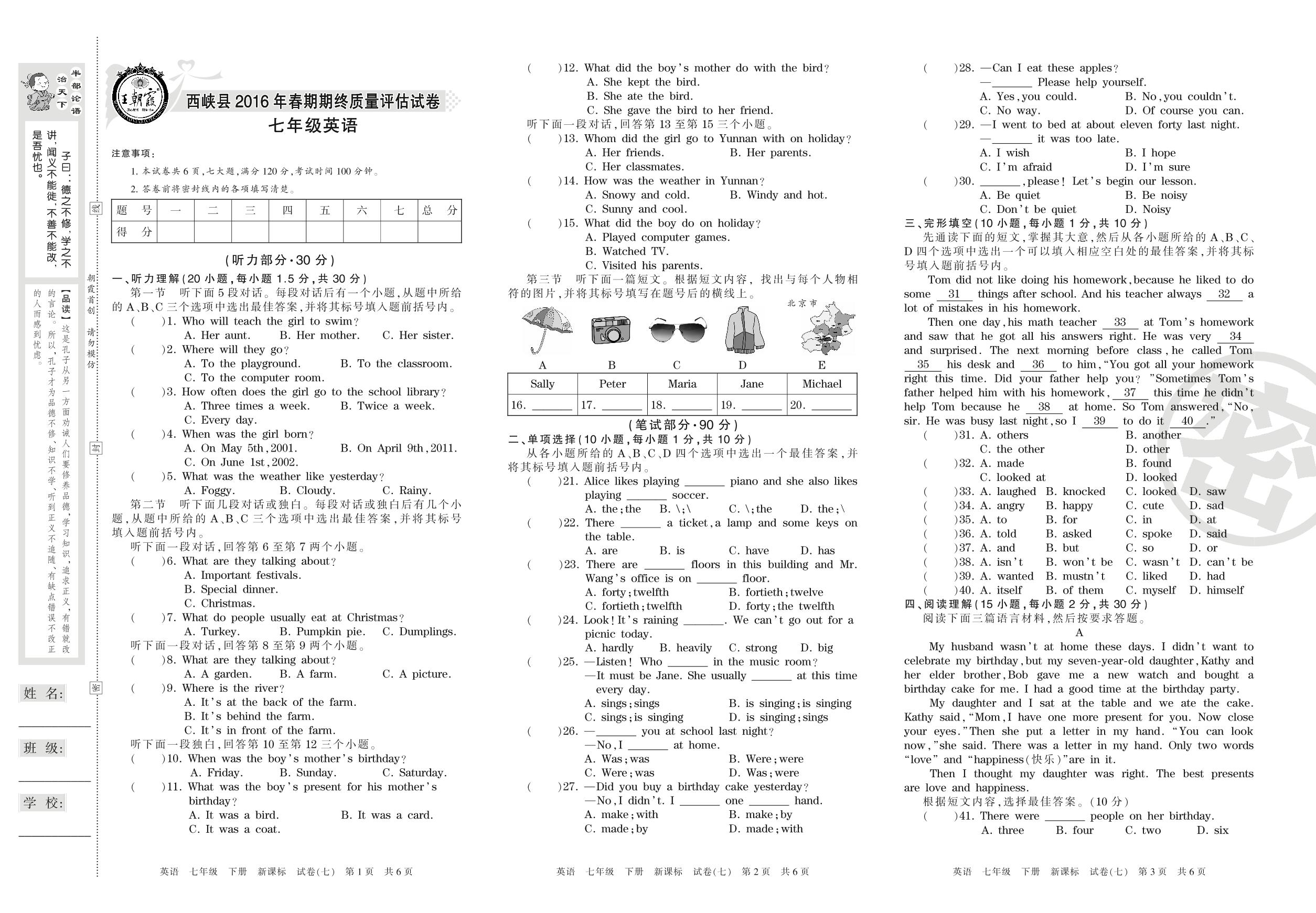 2015-2016学年第二学期南阳市西峡县七年级英语试卷(新课版)【7】
