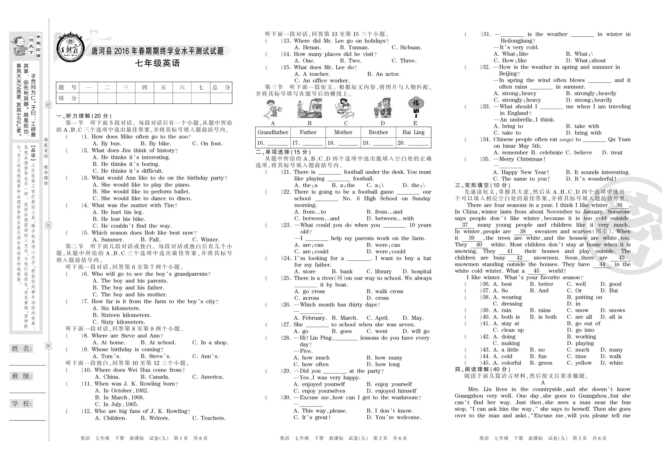 2015-2016学年第二学期南阳市唐河县七年级英语试卷(新课版)【9】