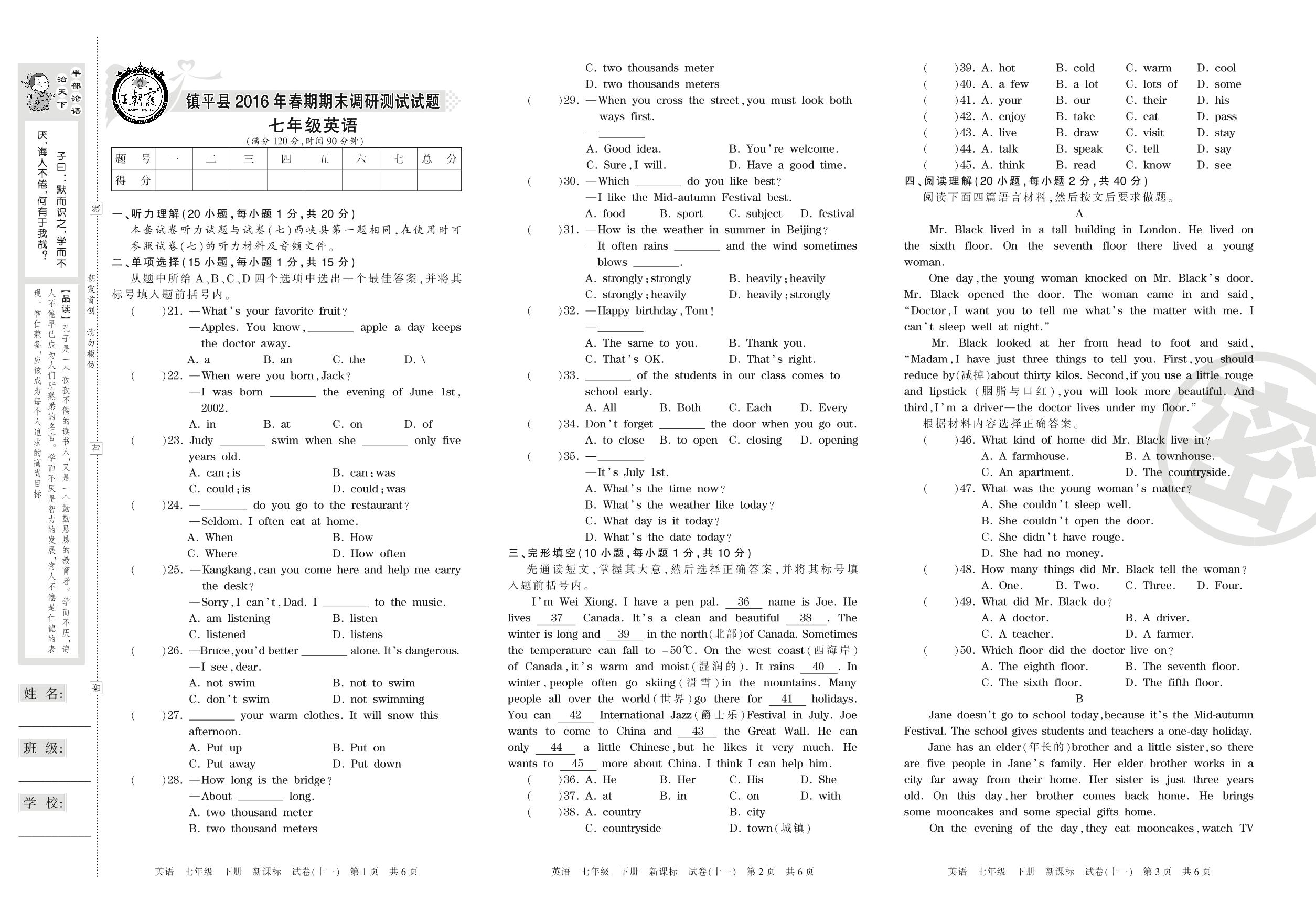 2015-2016学年第二学期南阳市镇平县七年级英语试卷(新课版)【11】