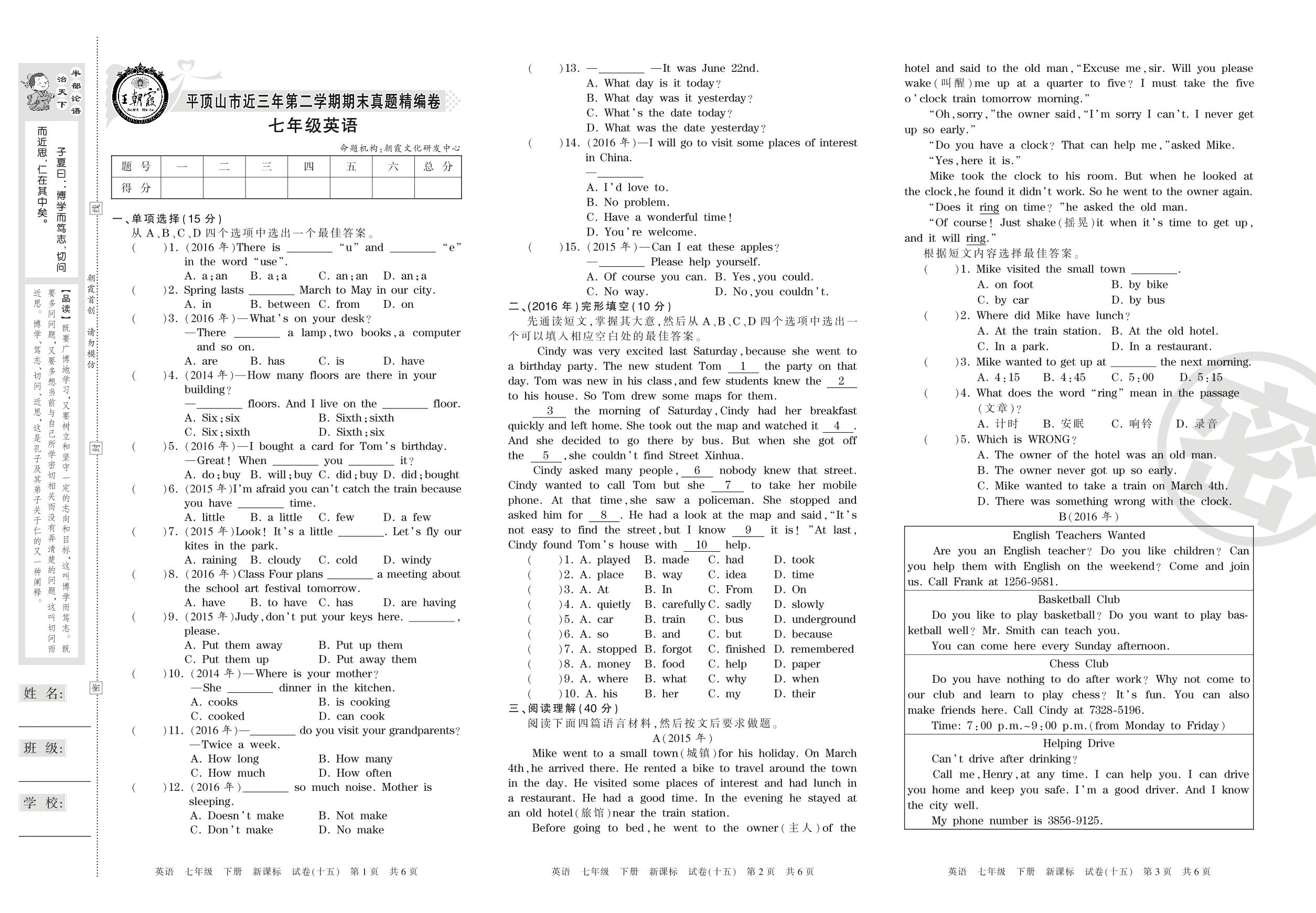 2015-2016学年第二学期平顶山市近三年精编七年级英语试卷(新课版)【15】