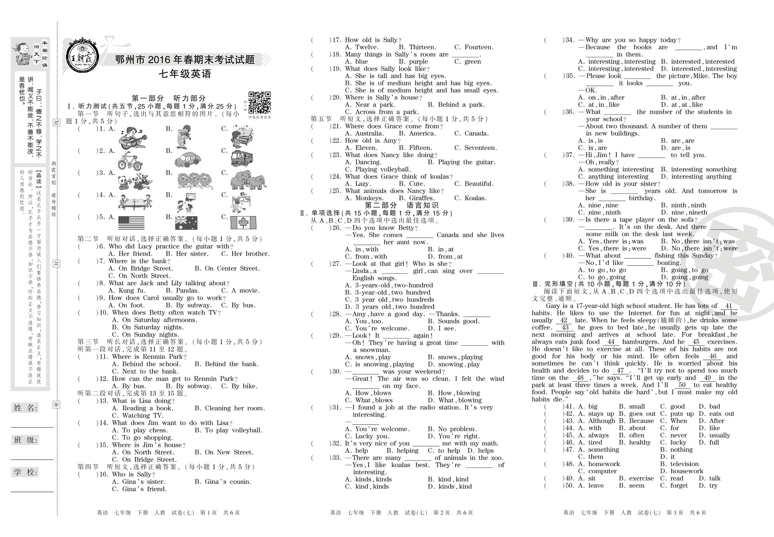 2015-2016学年第二学期鄂州市七年级英语试卷(人教版)【7】