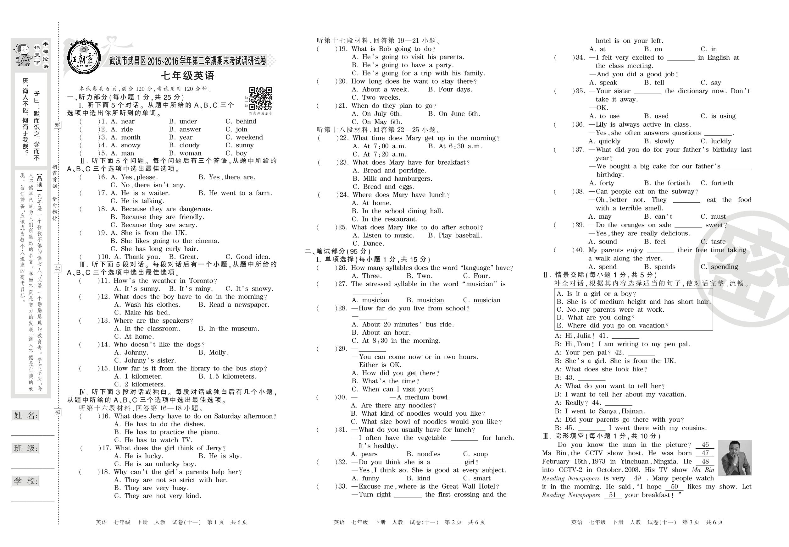 2015-2016学年第二学期武汉市武昌区七年级英语试卷(人教版)【11】