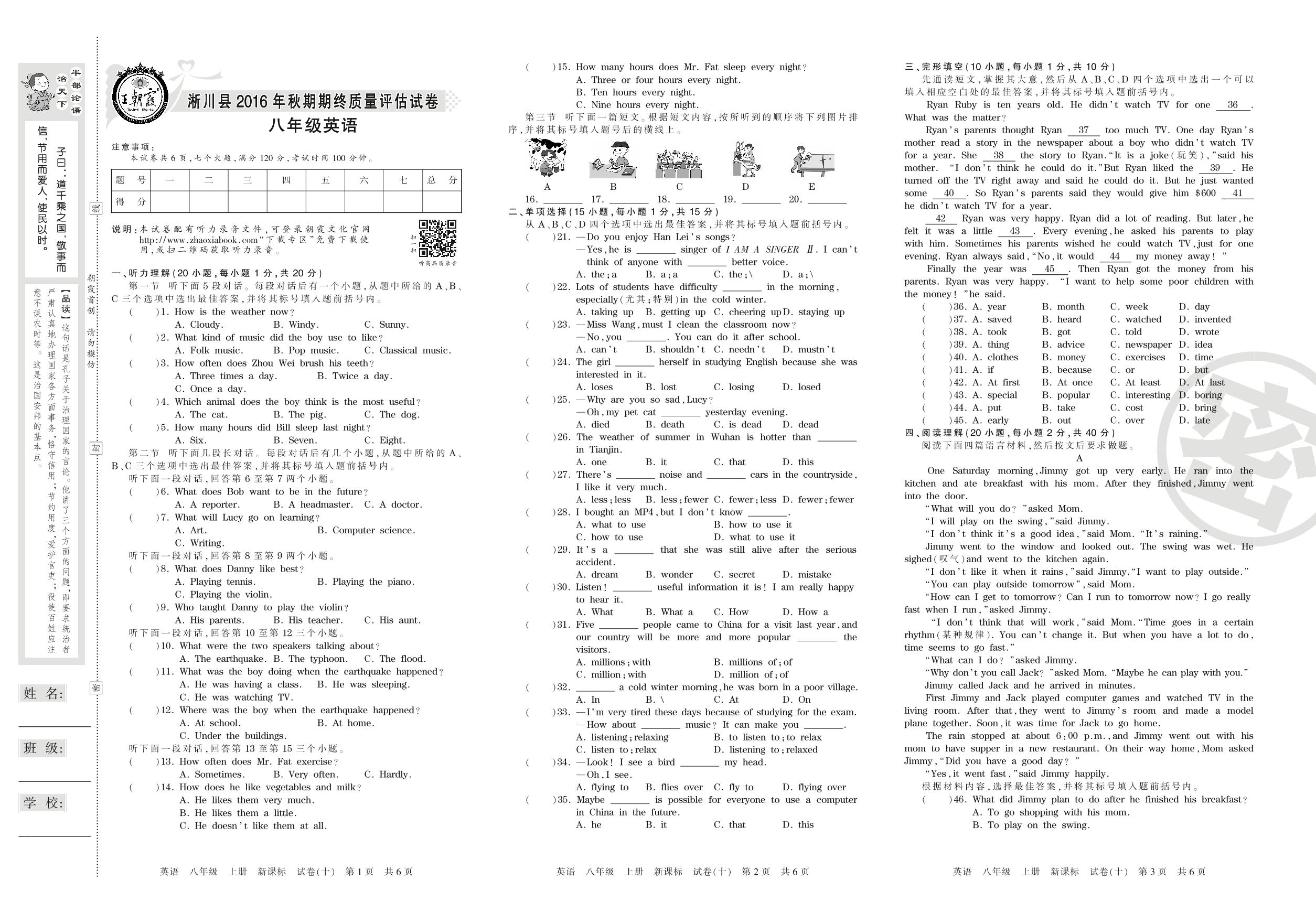 2016-2017学年第一学期南阳市淅川县七年级英语试卷(新课版)【10】