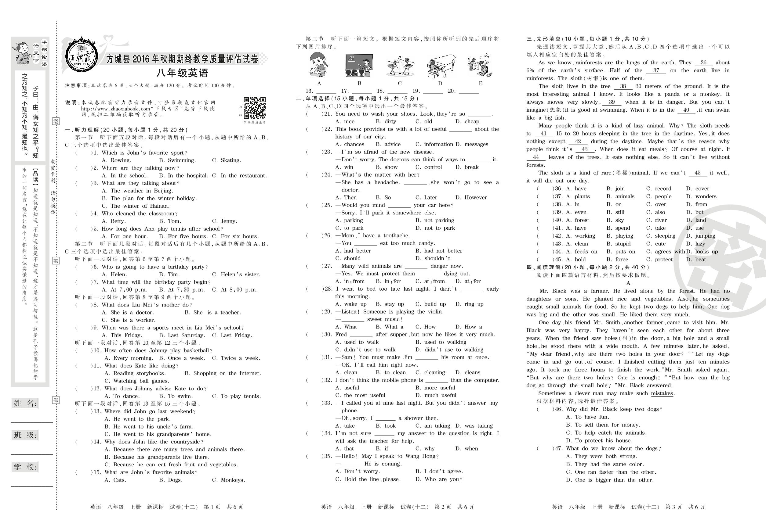 2016-2017学年第一学期南阳市方城县七年级英语试卷(新课版)【12】