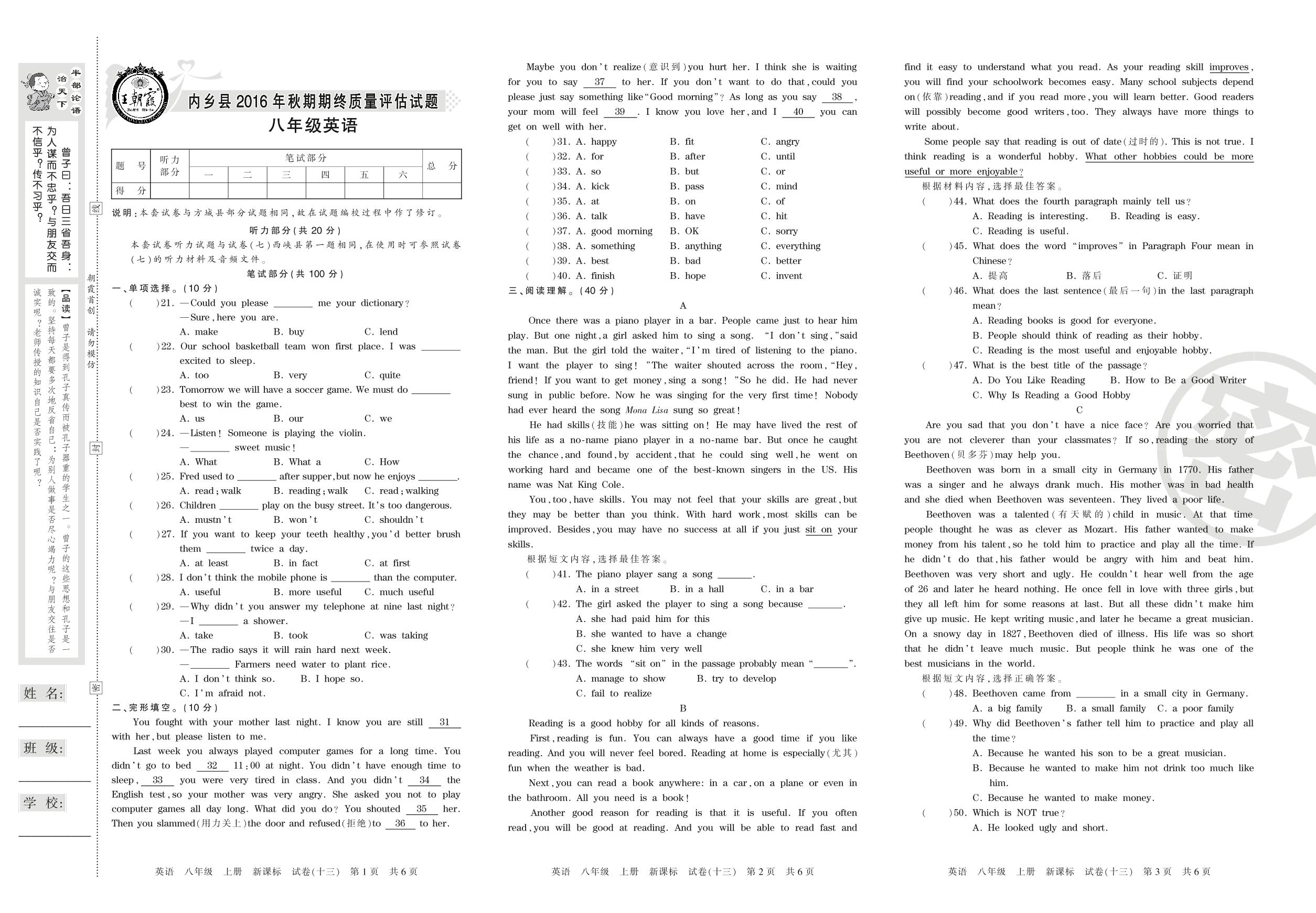 2016-2017学年第一学期南阳市内乡县七年级英语试卷(新课版)【13】