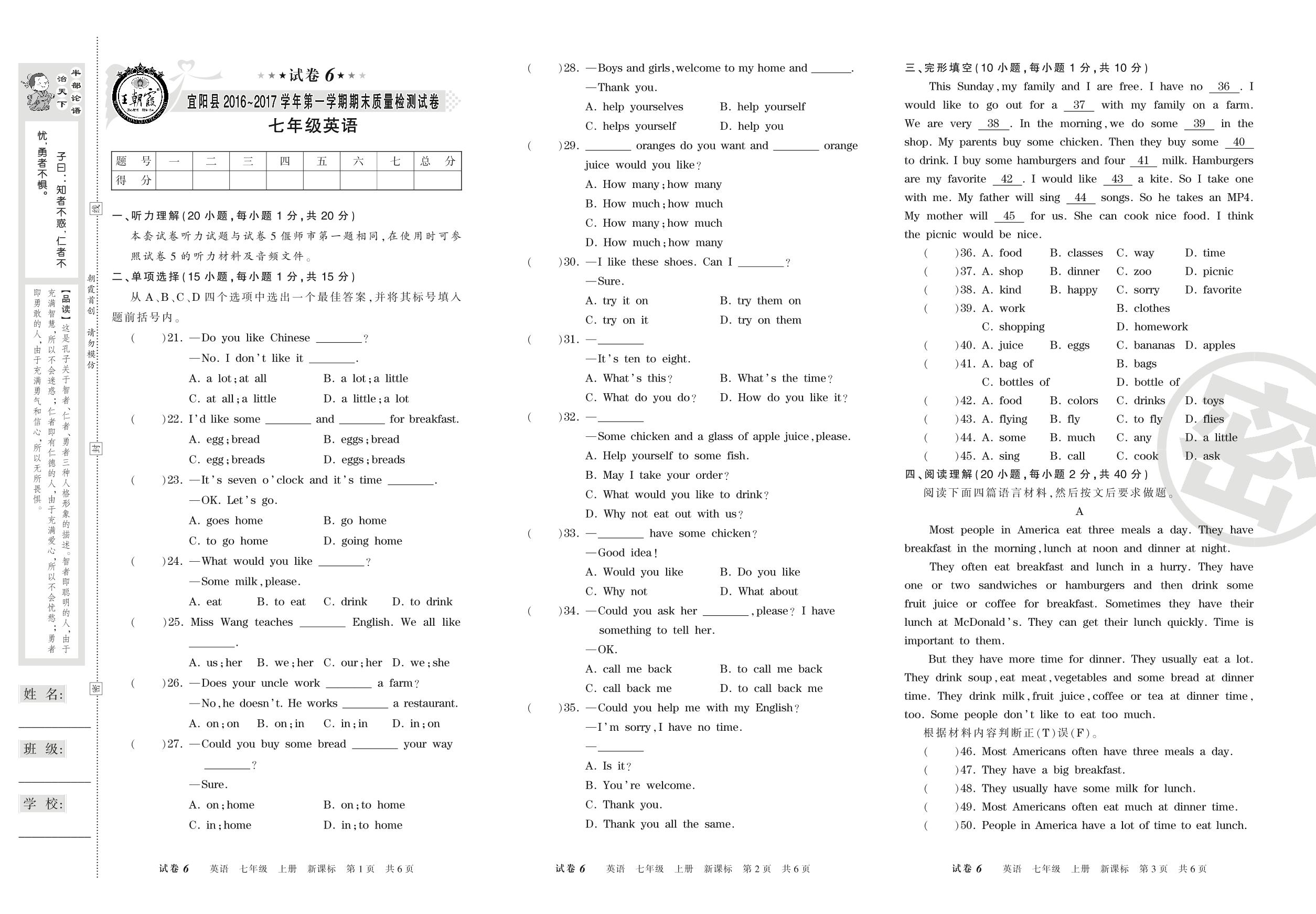 2016-2017学年第一学期洛阳市宜阳县七年级英语试卷(新课版)【6】
