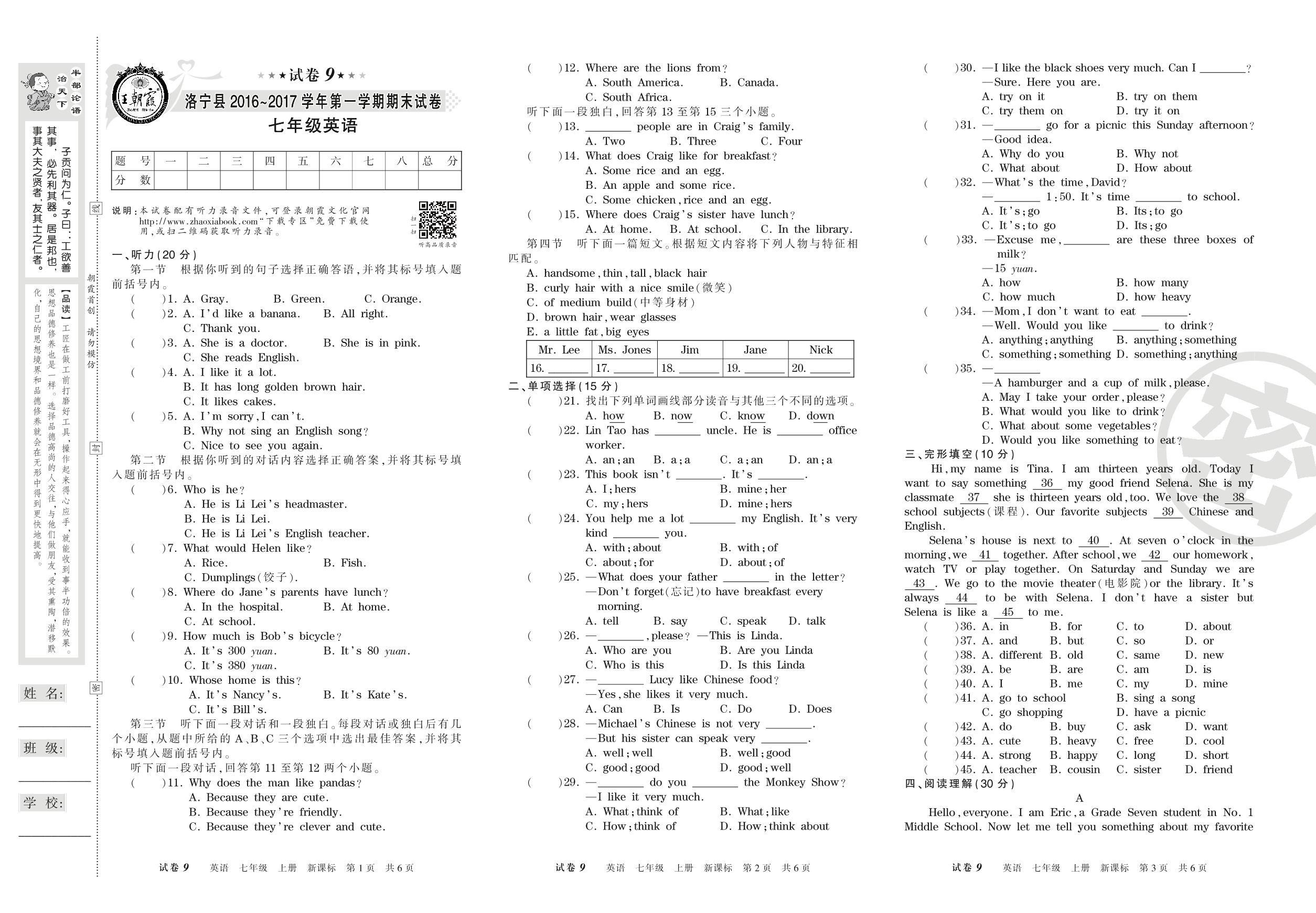 2016-2017学年第一学期洛阳市洛宁县七年级英语试卷(新课版)【9】