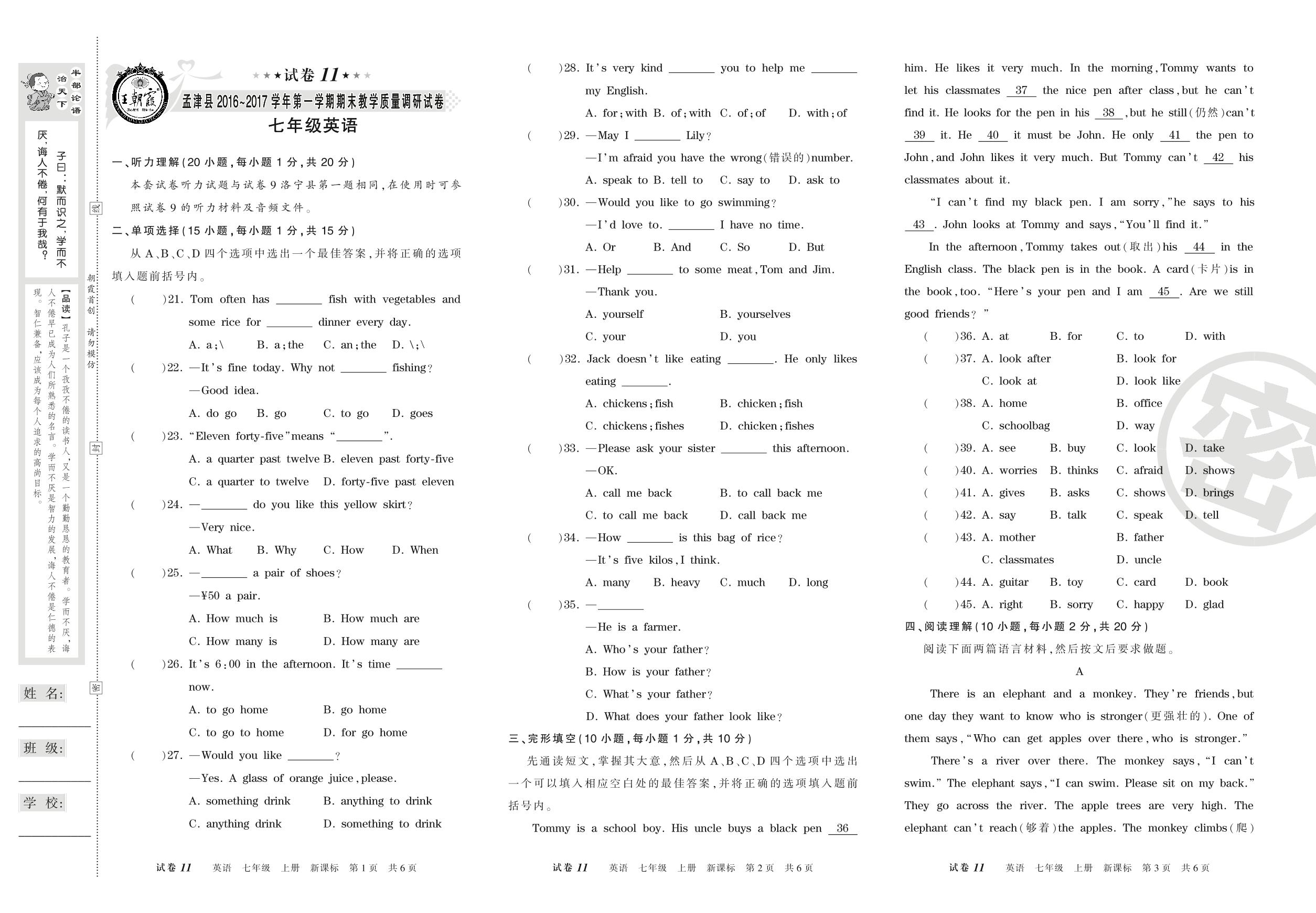 2016-2017学年第一学期洛阳市孟津县七年级英语试卷(新课版)【11】
