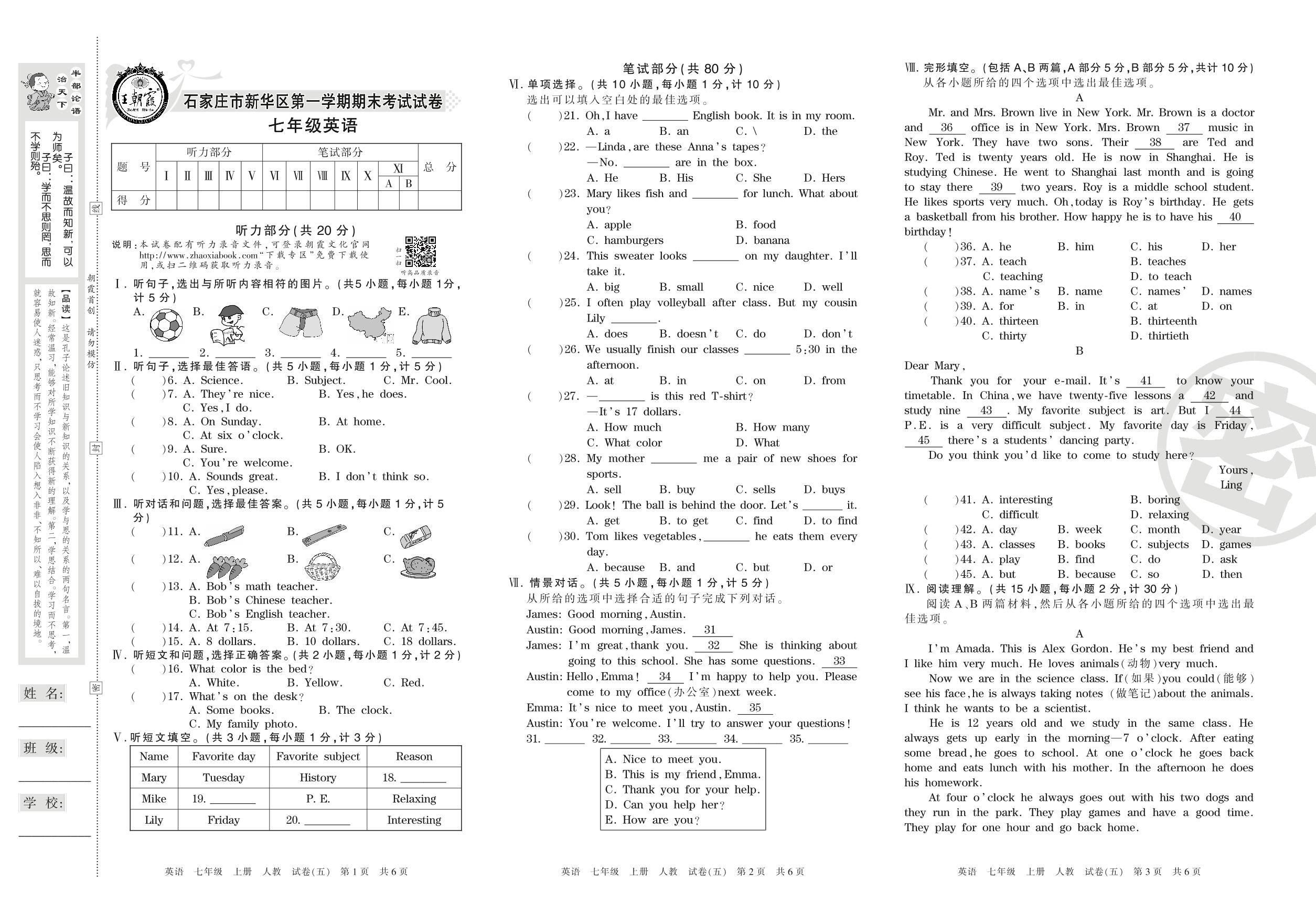2016-2017学年第一学期石家庄市新华区七年级英语试卷(人教版)【5】