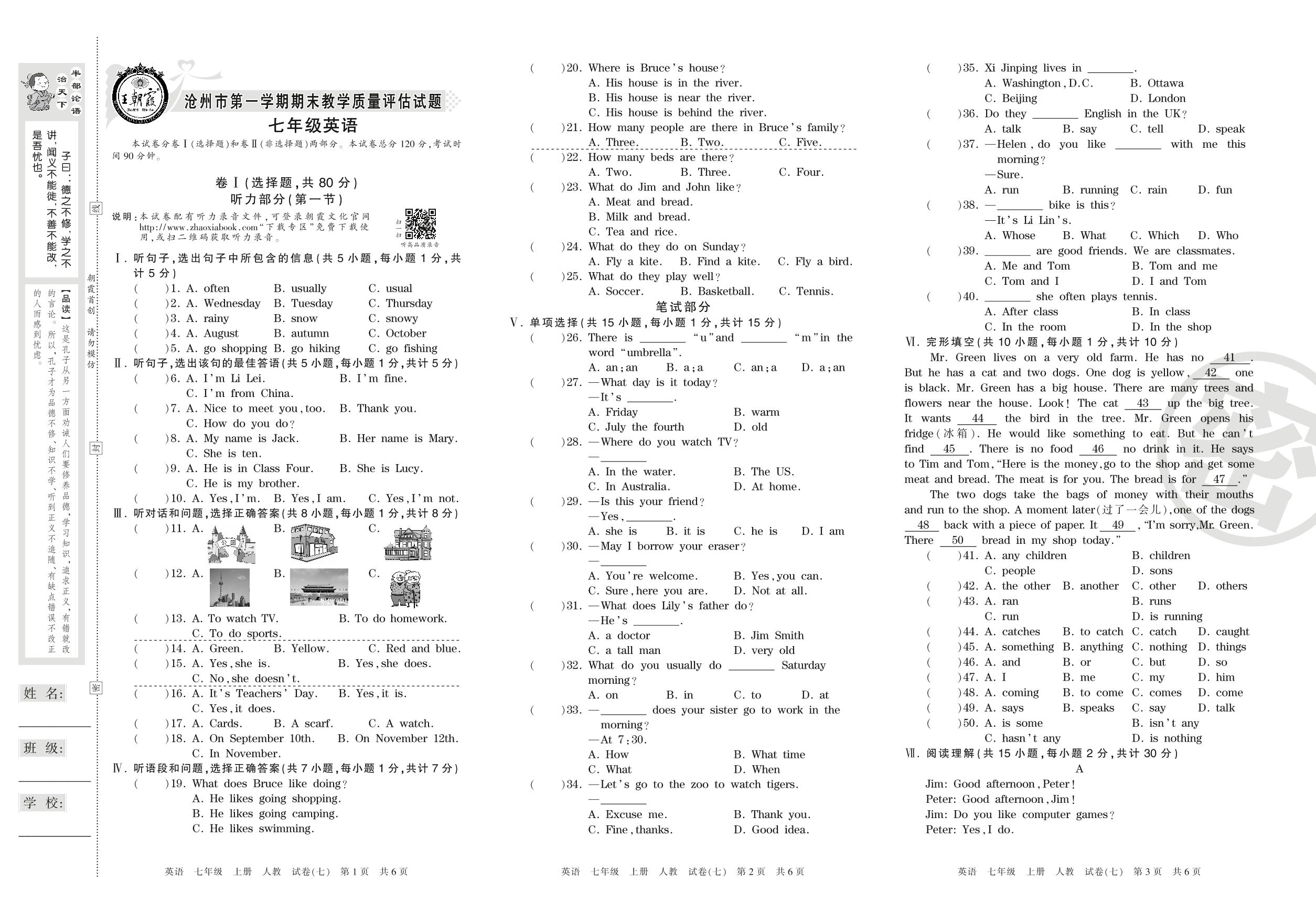 2016-2017学年第一学期沧州市七年级英语试卷(人教版)【7】