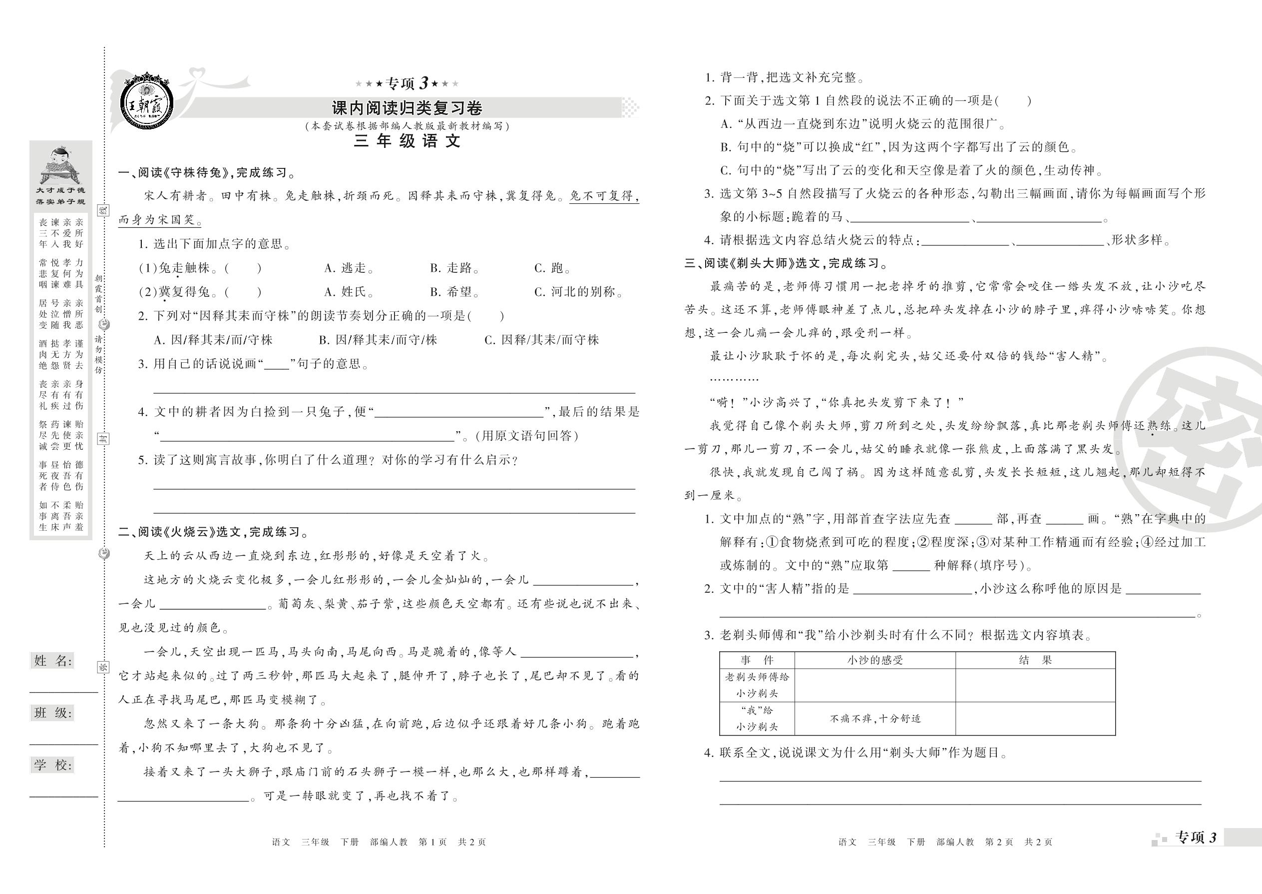 王朝霞期末专项卷——课内阅读、课外阅读真题归类复习卷三年级下册语文(人教版)_R21080190322【0】