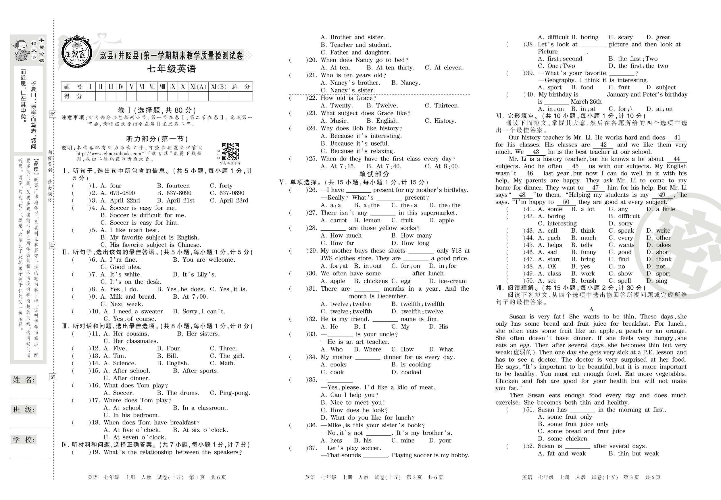 2016-2017学年第一学期石家庄市赵县(井陉县)七年级英语试卷(人教版)【15】