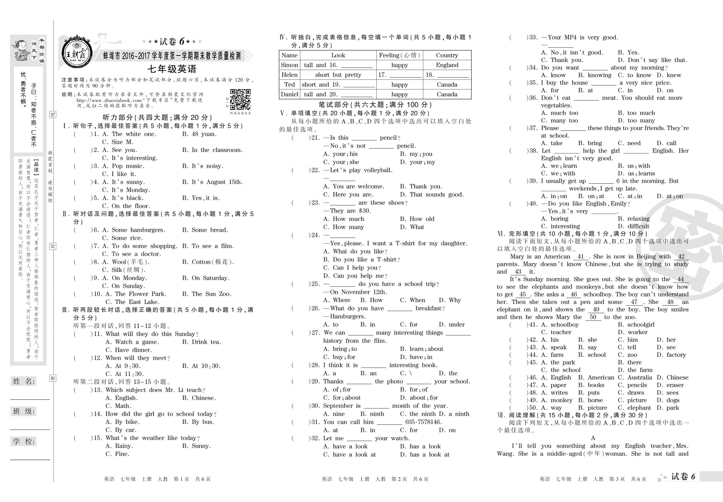 2016-2017学年第一学期蚌埠市七年级英语试卷(人教版)【6】