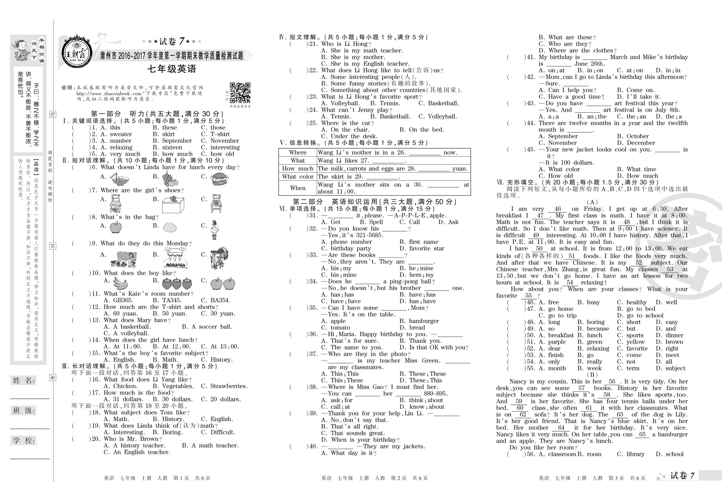 2016-2017学年第一学期滁州市七年级英语试卷(人教版)【7】