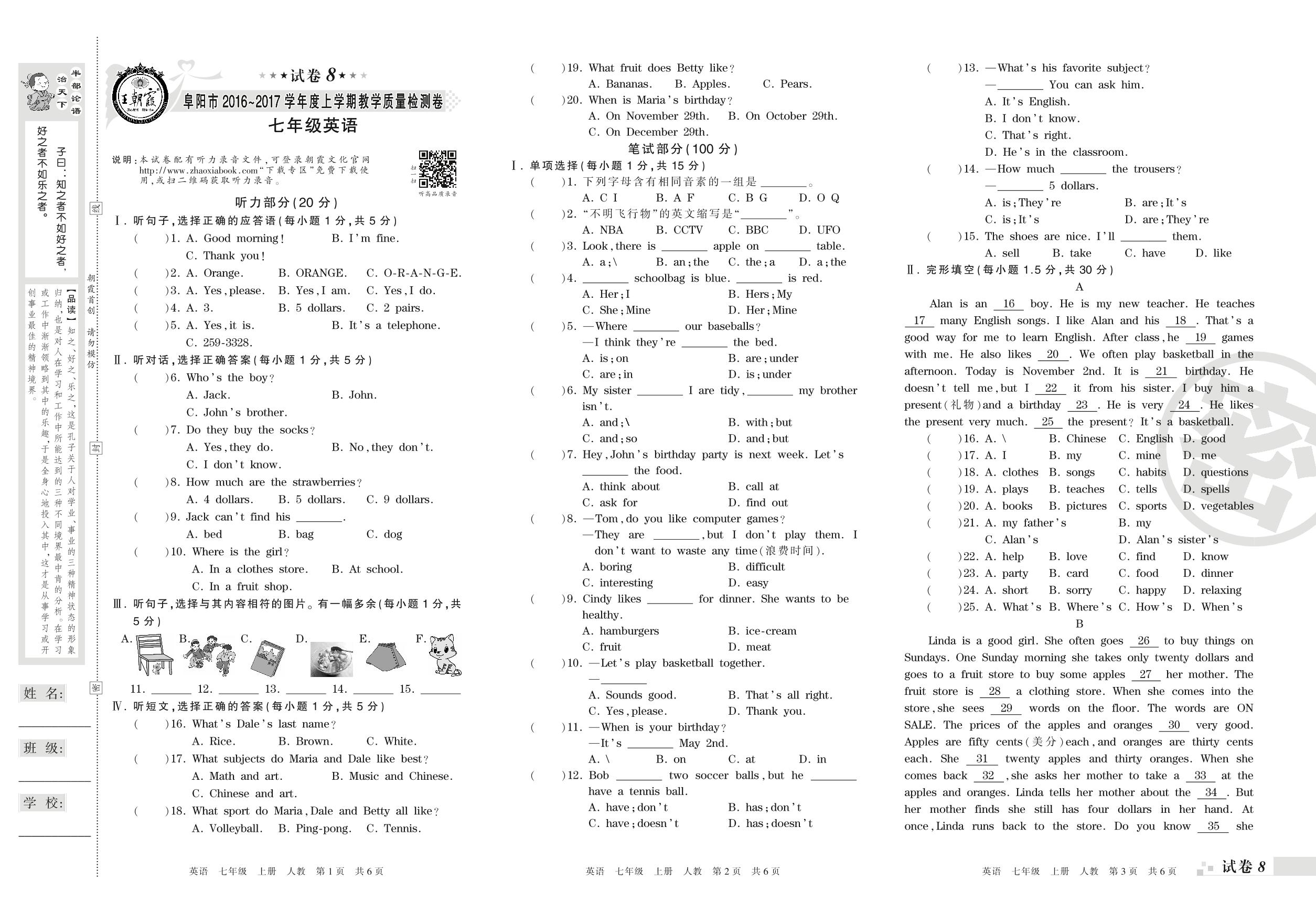 2016-2017学年第一学期阜阳市七年级英语试卷(人教版)【8】