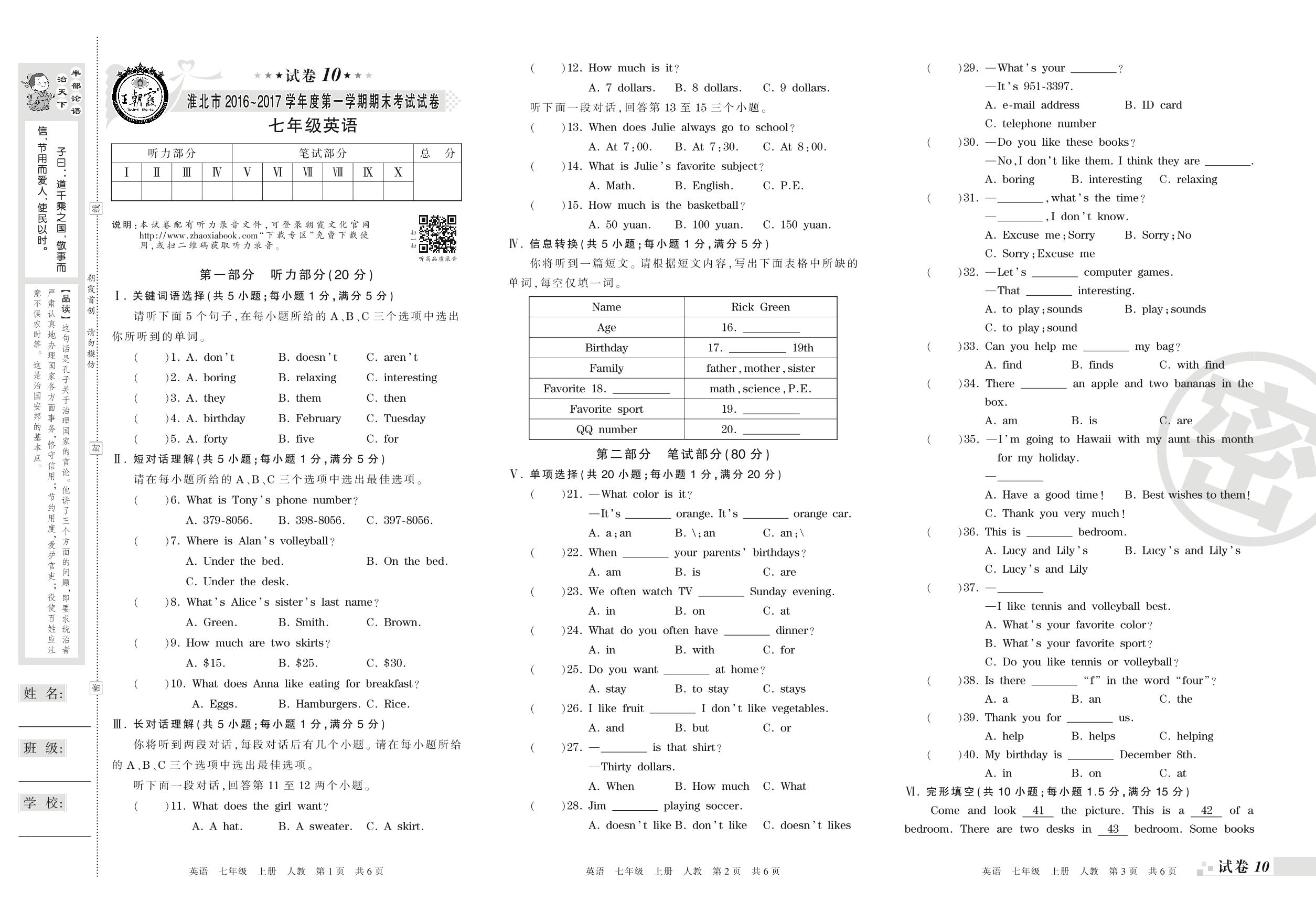 2016-2017学年第一学期淮北市七年级英语试卷(人教版)【10】