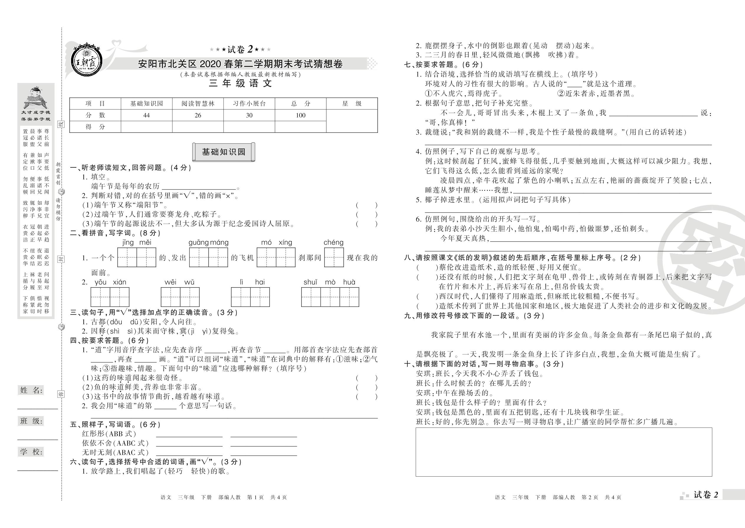 2018-2019学年第二学期安阳市北关区猜想卷三年级语文试卷(人教版)【2】
