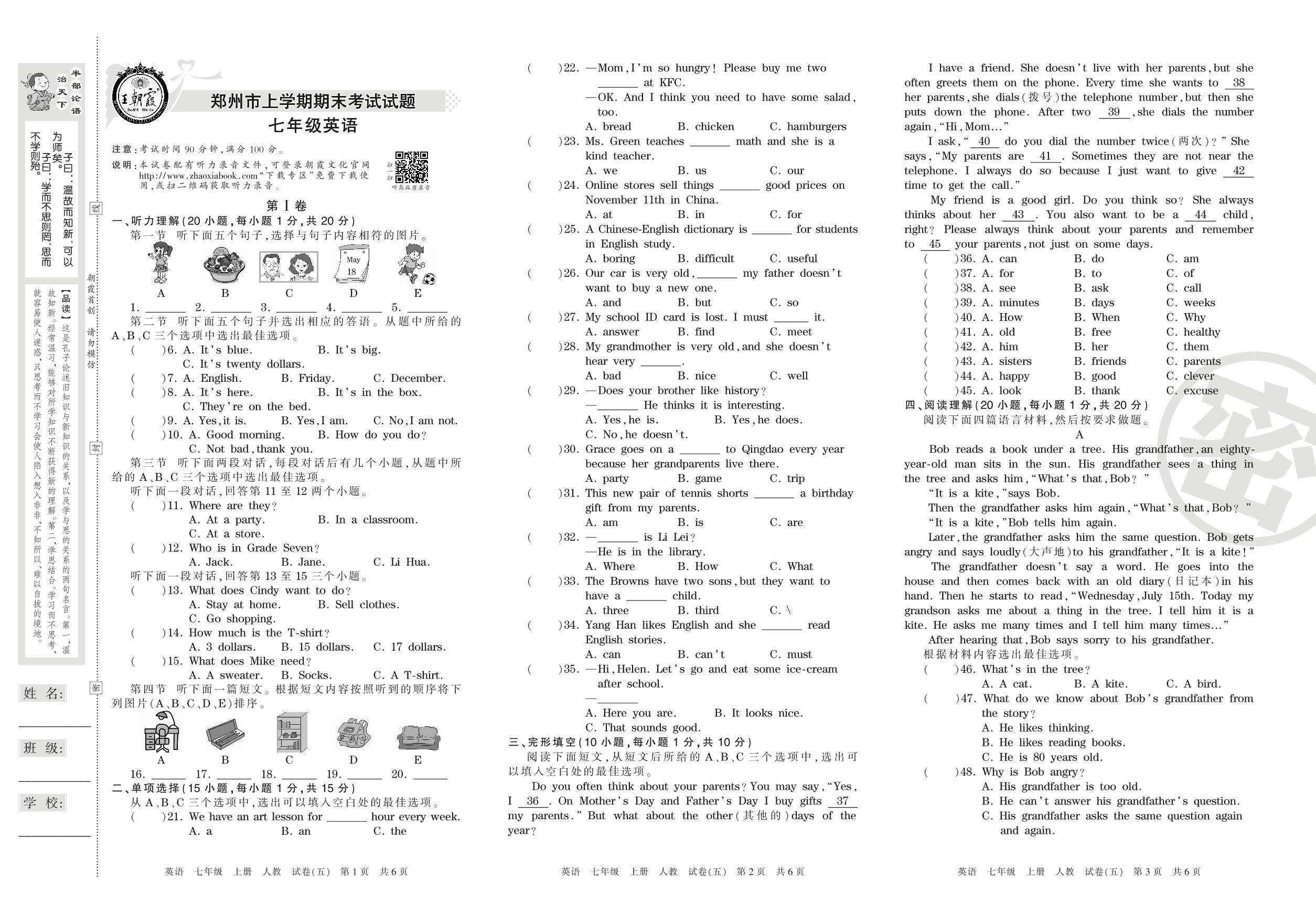 2016-2017学年第一学期郑州市七年级英语试卷(人教版)_R210807211302【5】