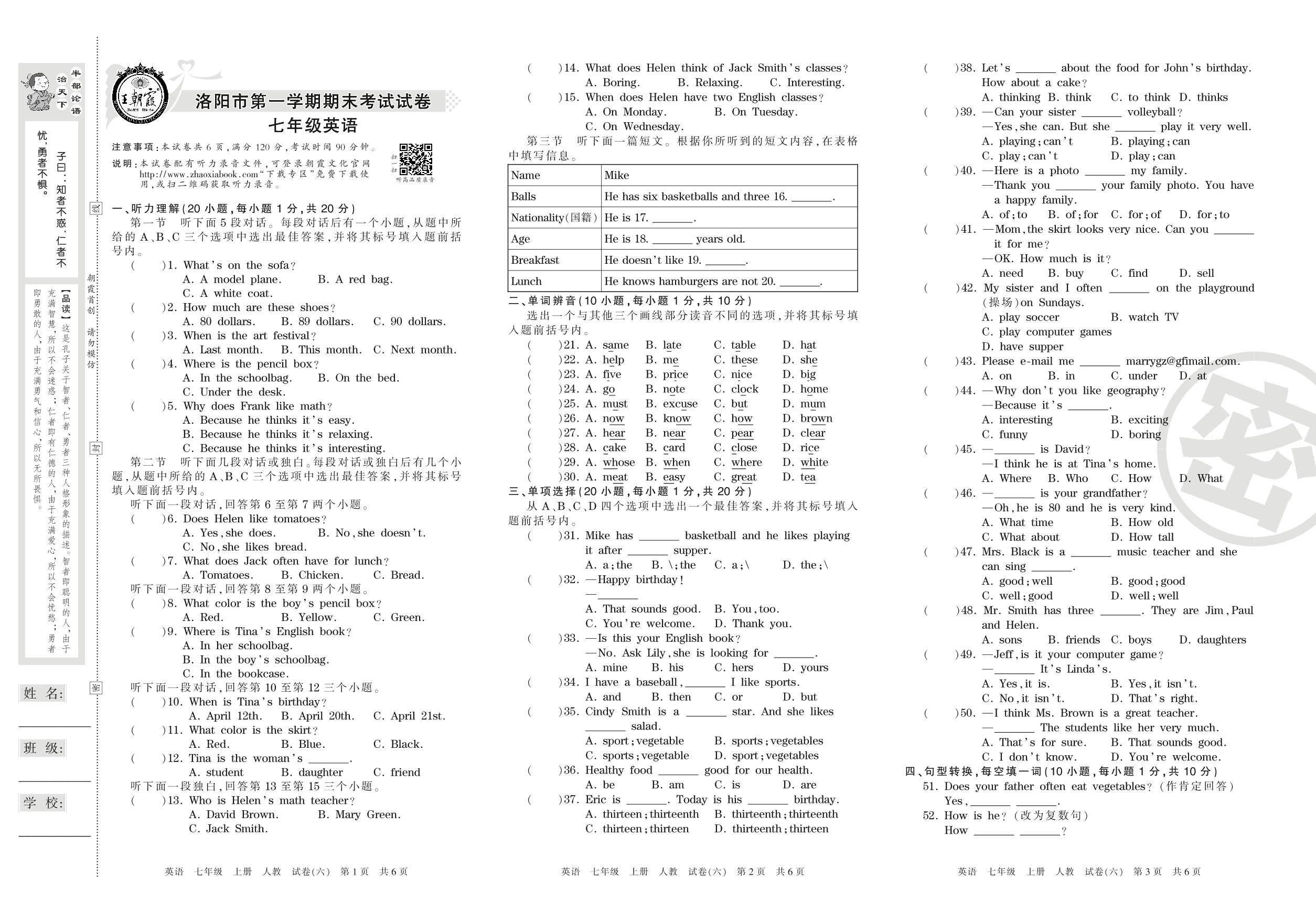 2016-2017学年第一学期洛阳市七年级英语试卷(人教版)【6】