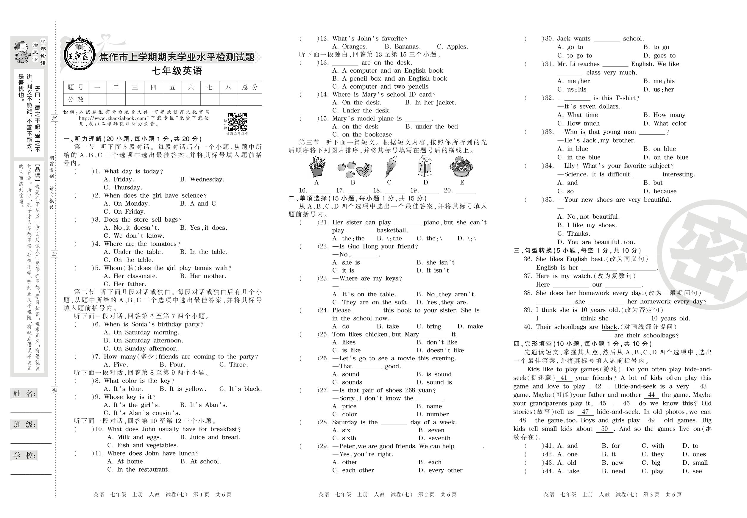 2016-2017学年第一学期焦作市七年级英语试卷(人教版)【7】