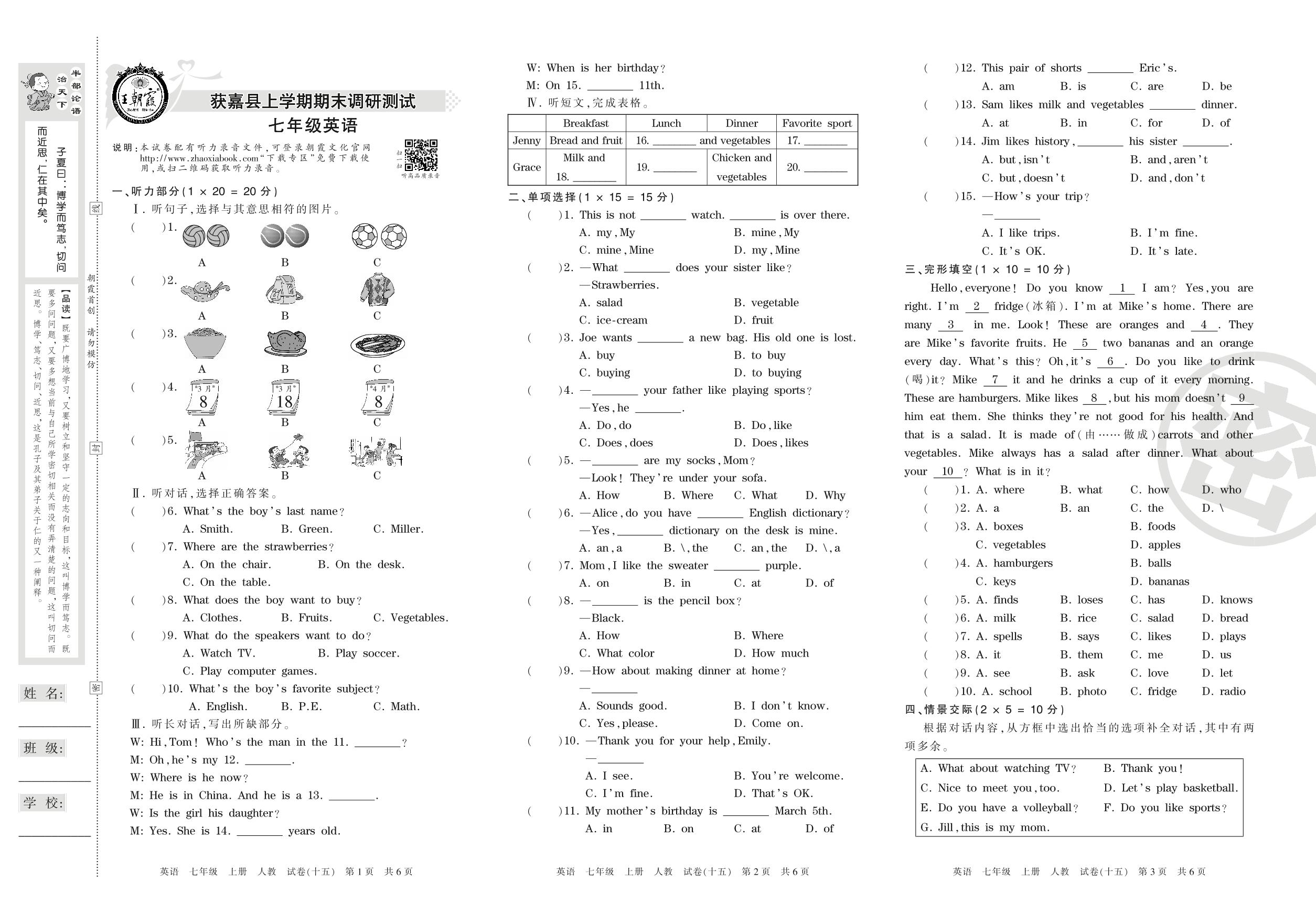 七年级英语人教版上册期末卷