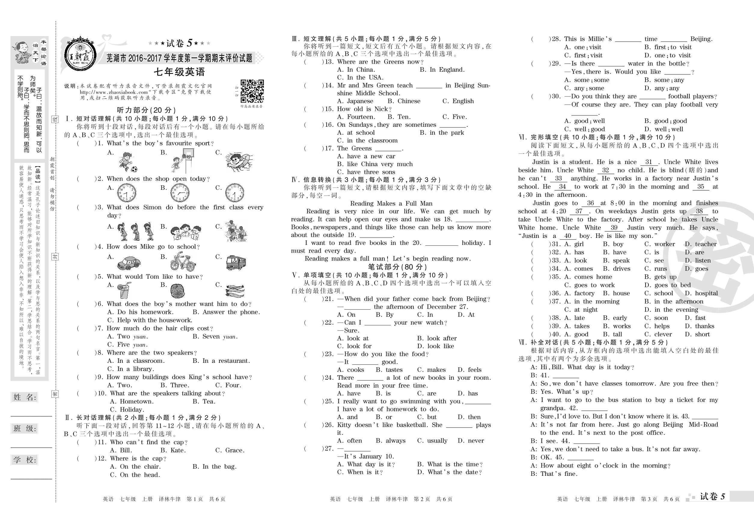 2016-2017学年第一学期芜湖市七年级英语试卷(译林版)【5】