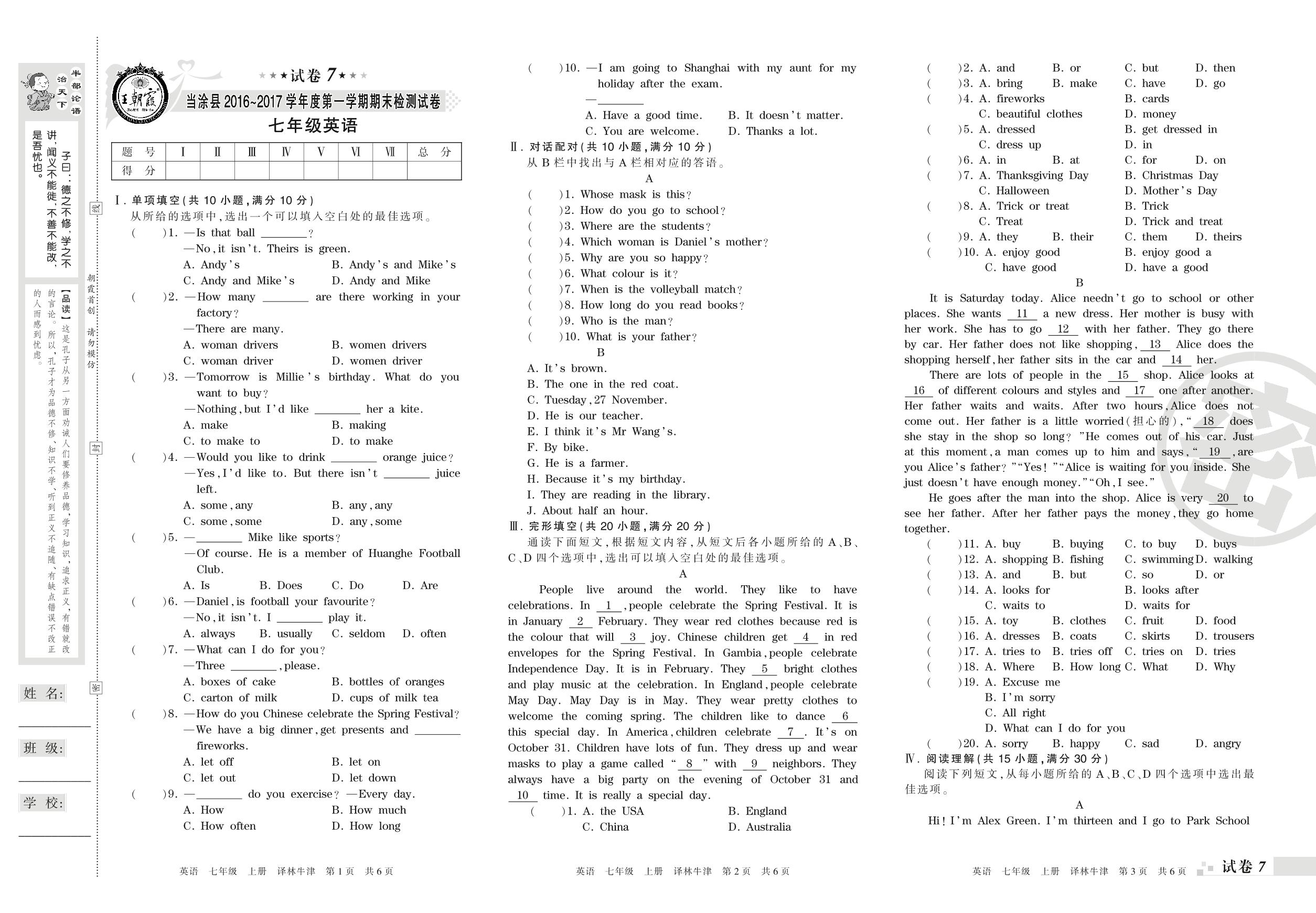 2016-2017学年第一学期马鞍山市当涂县七年级英语试卷(译林版)【7】
