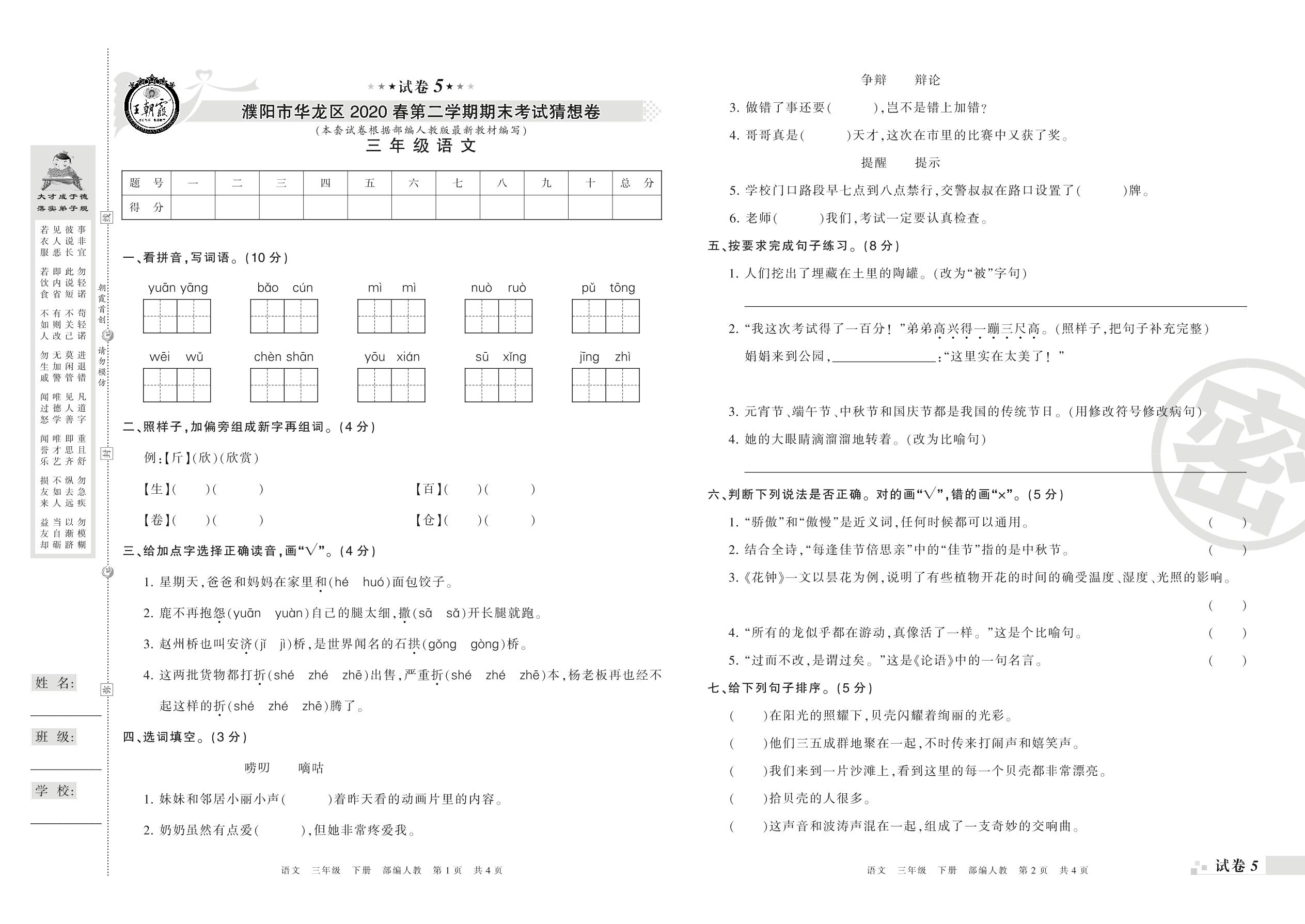 2018-2019学年第二学期濮阳市华龙区猜想卷三年级语文试卷(人教版)【5】