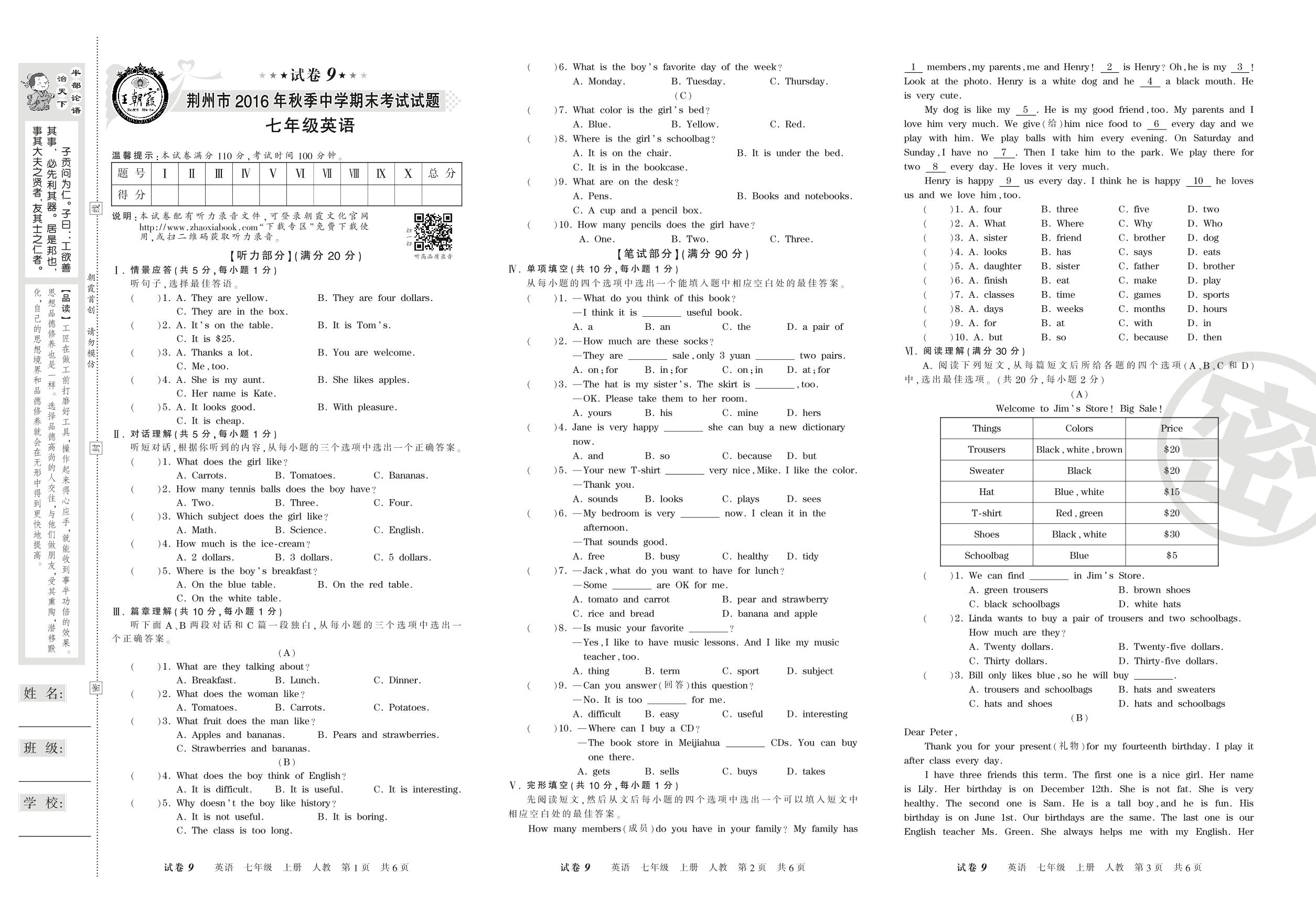 2016-2017学年第一学期荆州市七年级英语试卷(人教版)【9】