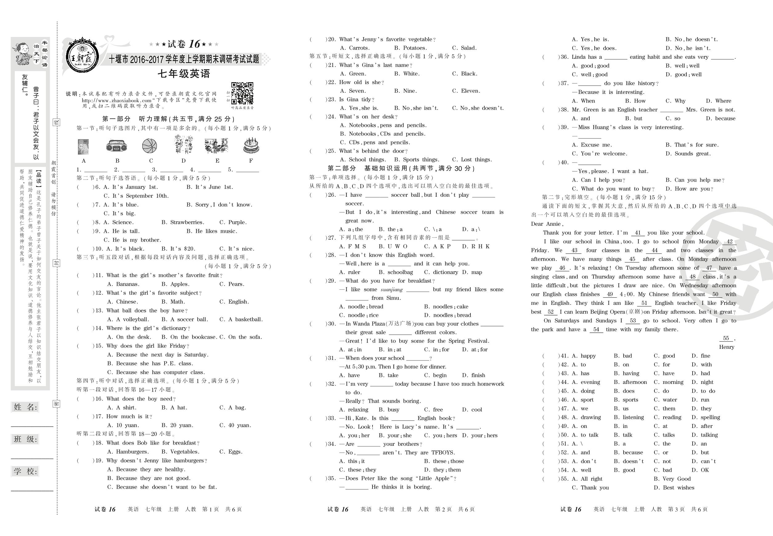 2016-2017学年第一学期十堰市七年级英语试卷(人教版)【16】