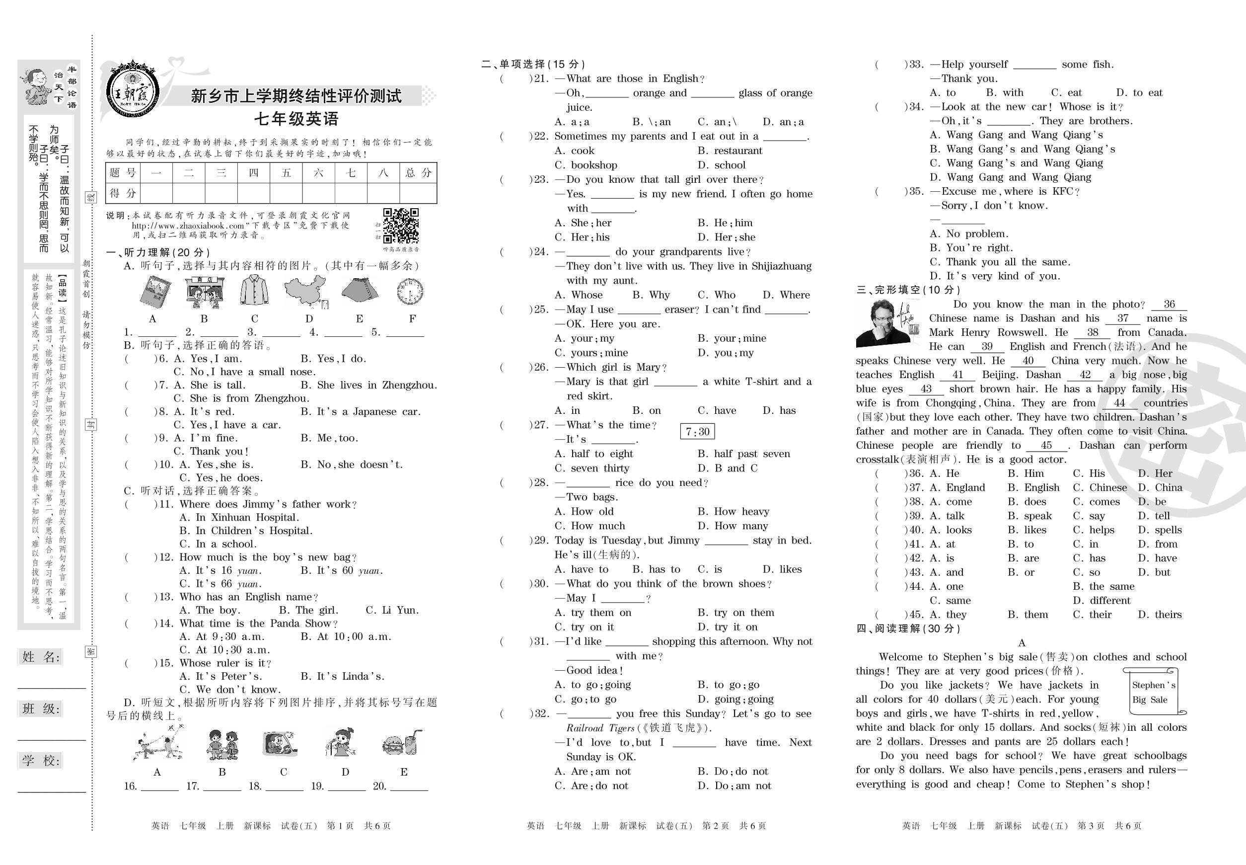 2016-2017学年第一学期新乡市七年级英语试卷(新课版)【5】