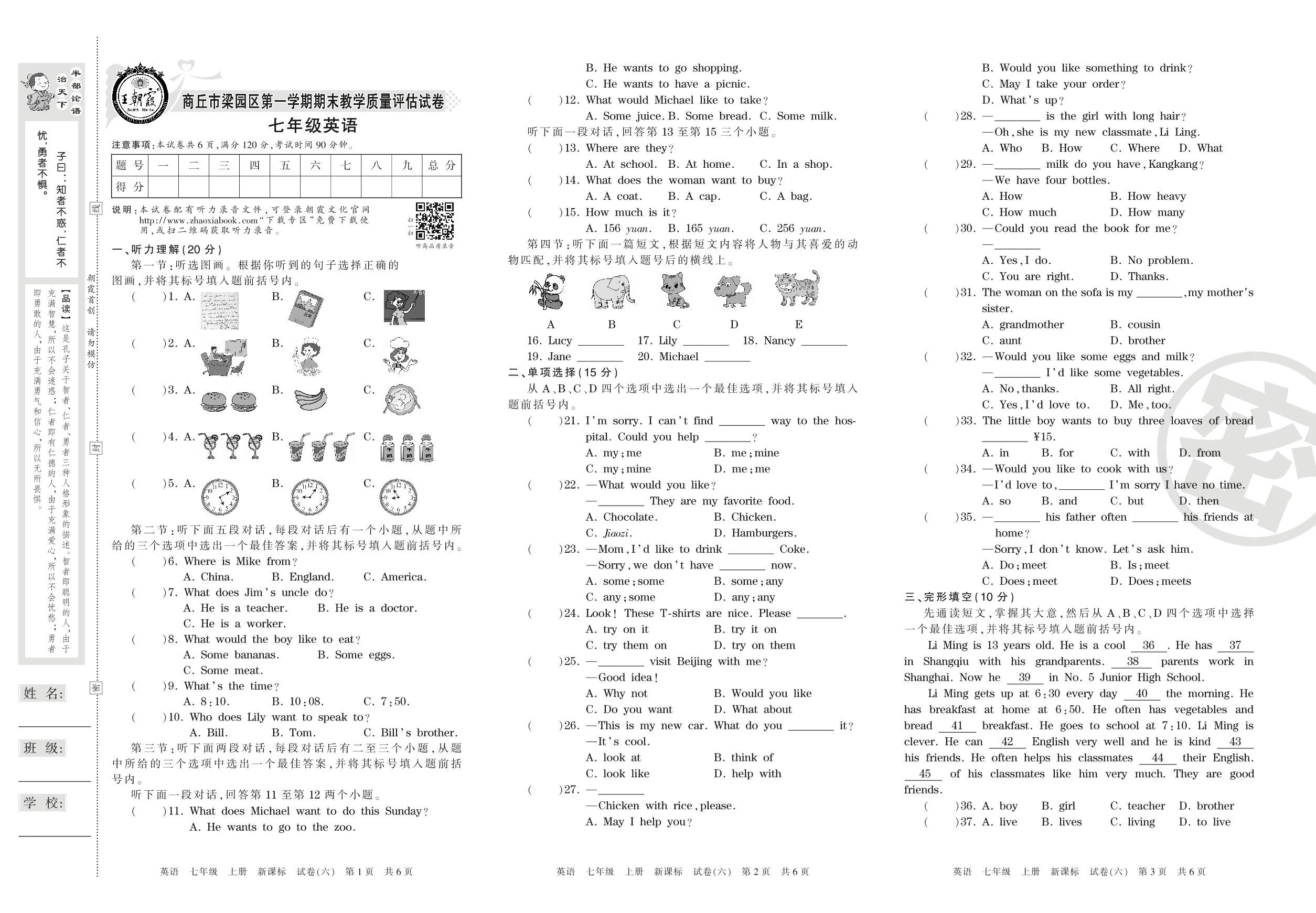 2016-2017学年第一学期商丘市梁园区七年级英语试卷(新课版)【6】